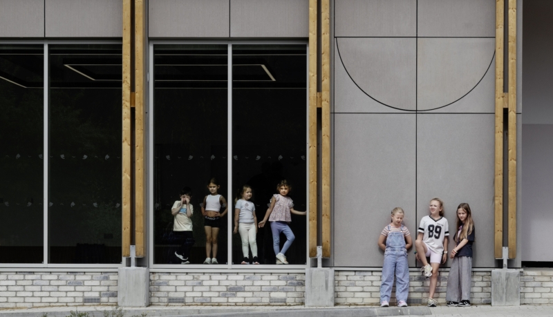 A compact two-classroom building by ČTYŘSTĚN brings sheltered gardens, rooftop play space and vibrant interiors to a tight residential site in Šlapanice.