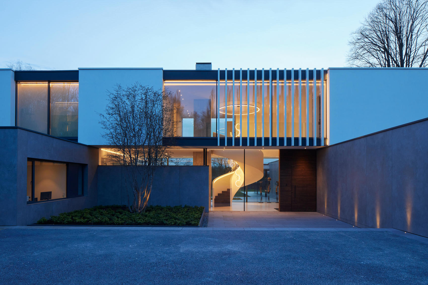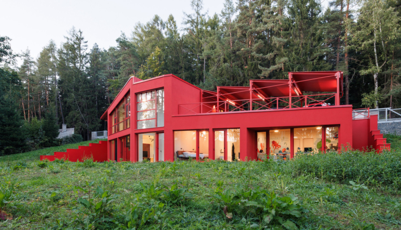 Located on a steeply sloping site in Jevany, Czech Republic, Architektura has completed a visually-striking house that employs sectional design and a robust material palette to frame views and connect domestic life with the surrounding forest.