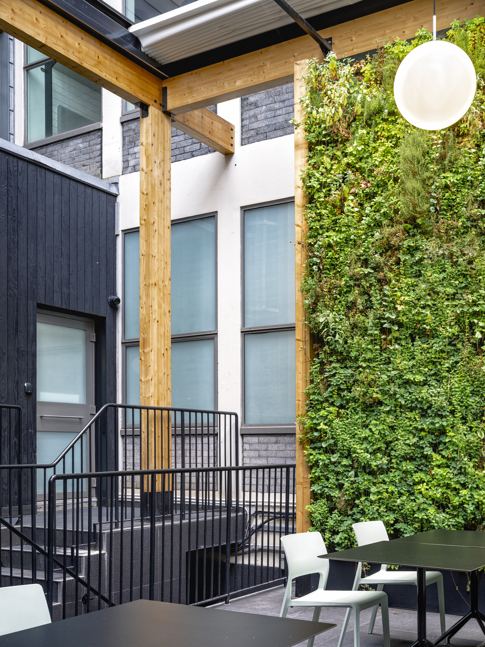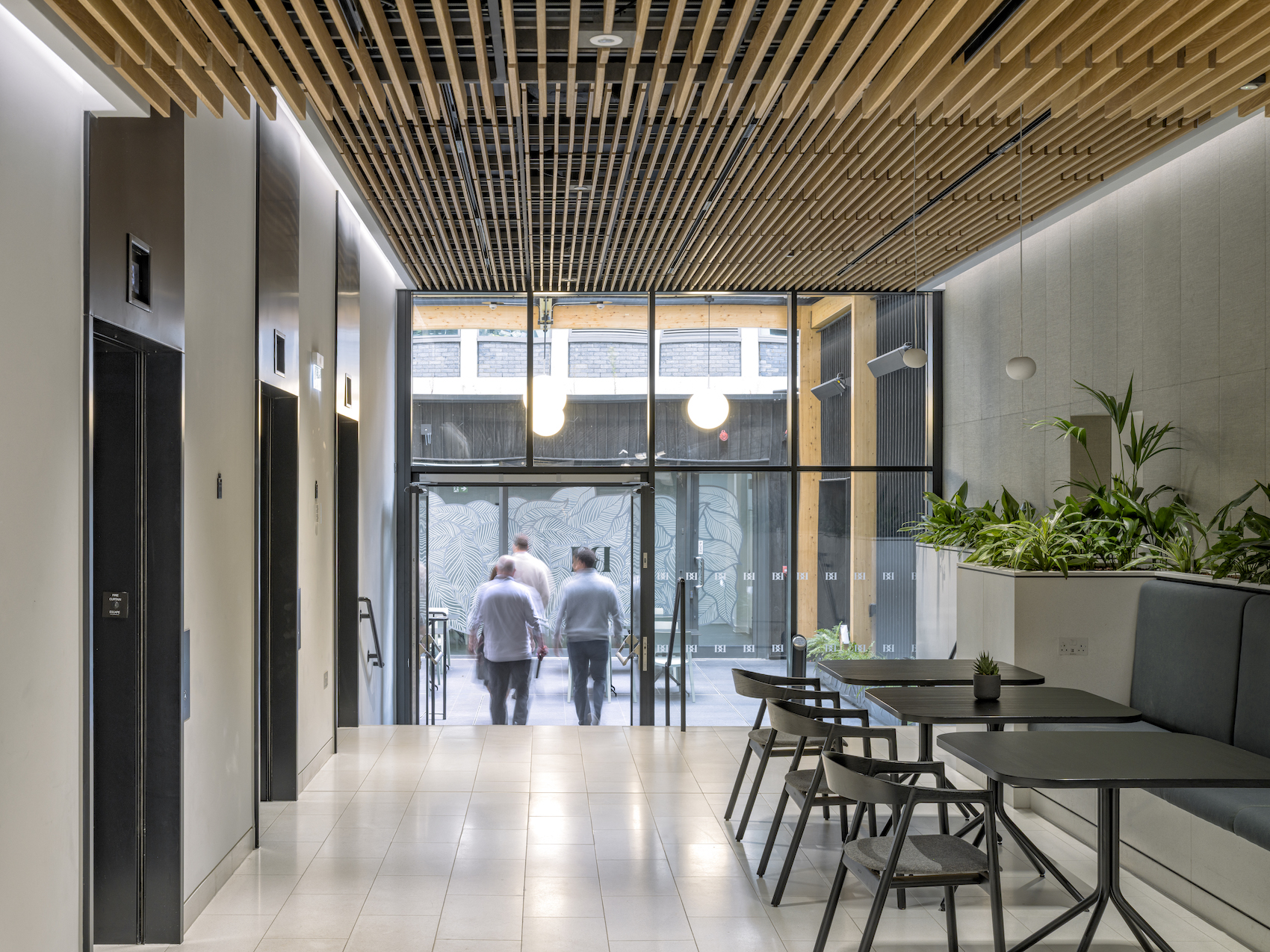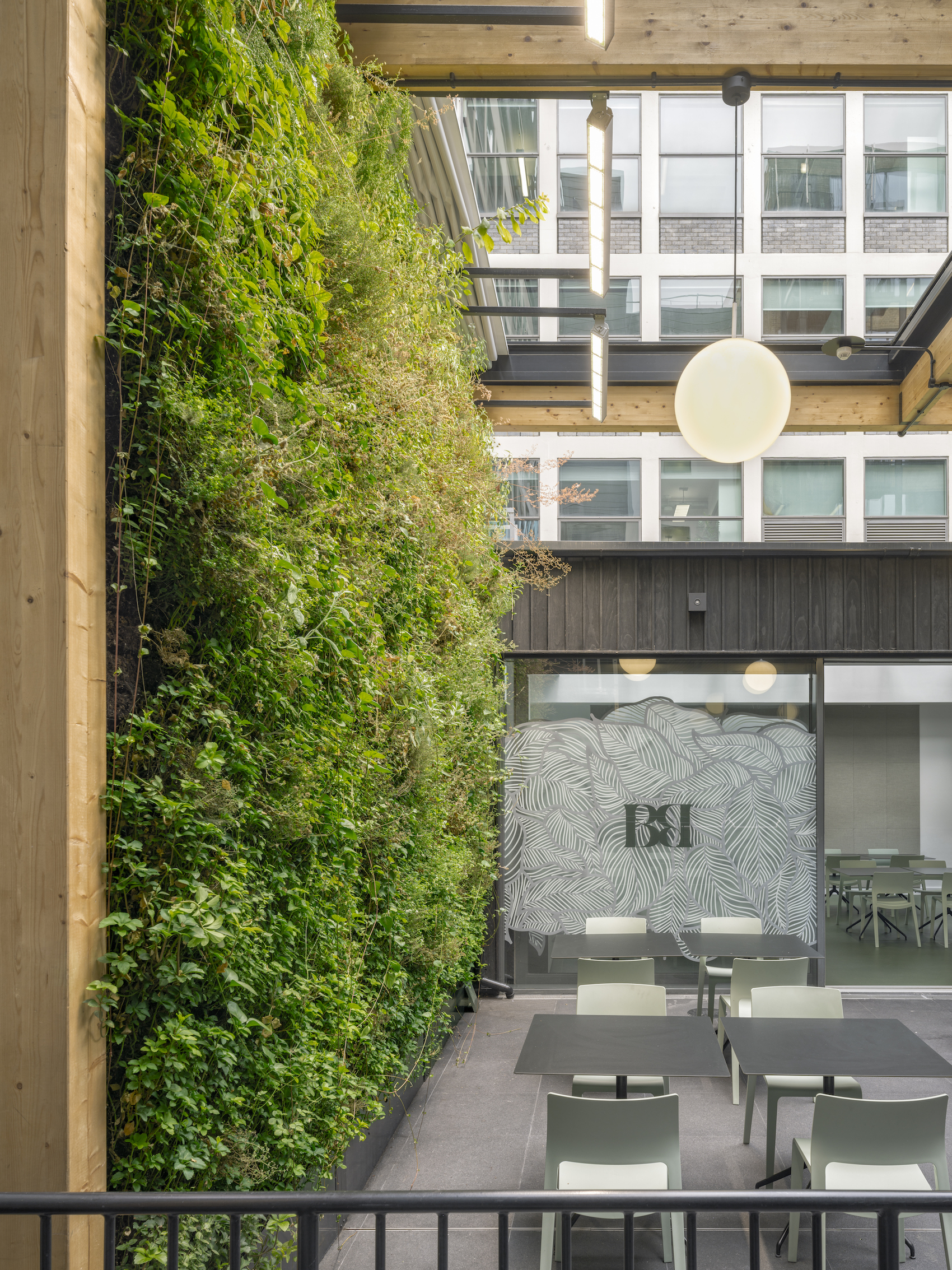 The introduction of a green façade – claimed to be the first in the borough – extends into the interior, where biophilia is used, threading through the entrance, circulation and workspace. Internal green walls and planting are distributed throughout aligning with the emerging culture of wellness-driven workplaces.