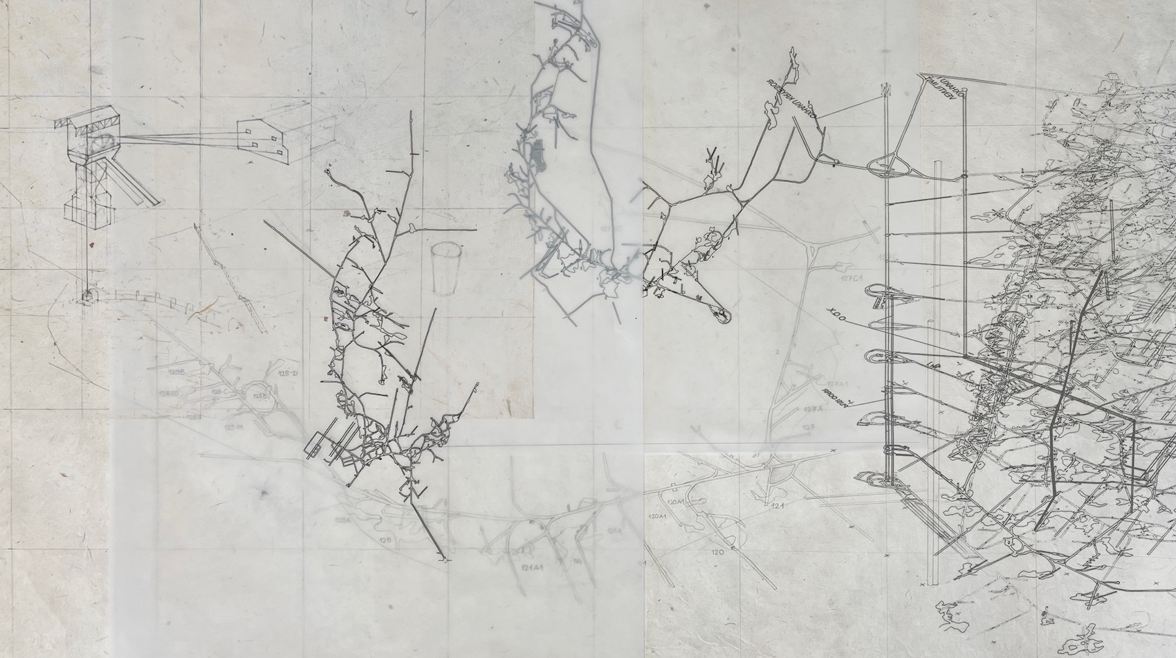 When it comes to representations of the underground, we like to emphasise the fact that rendering the underground legible is a rather recent historical development. While we do use the limited existing technical drawings of Trepça, mostly for our own understanding of the mine, we deliberately strain away from their original technical purpose. So, instead of producing scaled documents, we are working with free drawing in order to trace the spatial relationships that miners so often discuss in abstract forms.