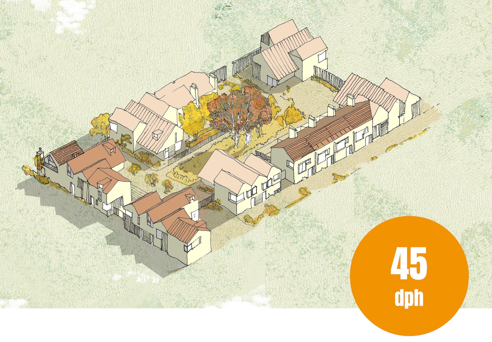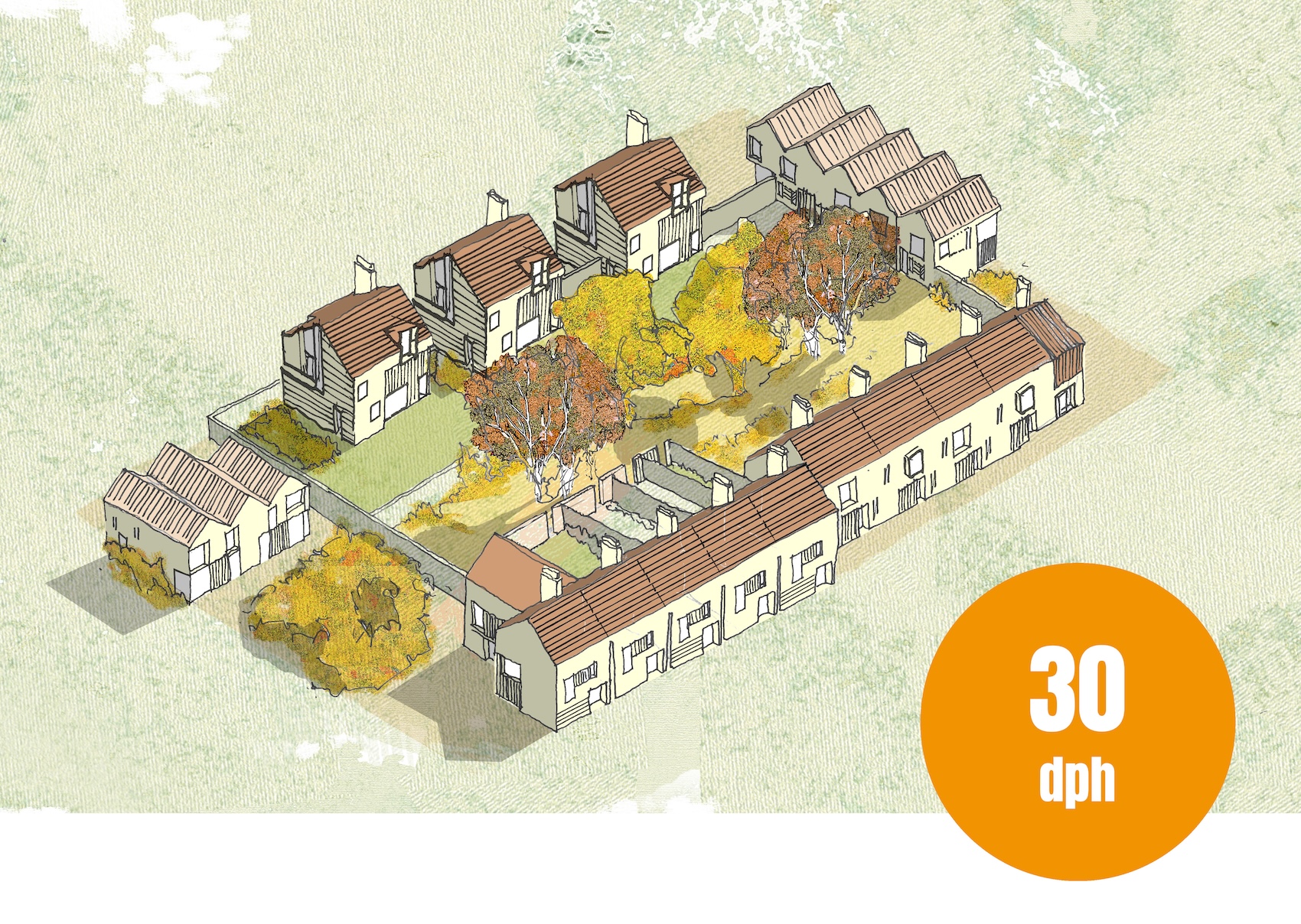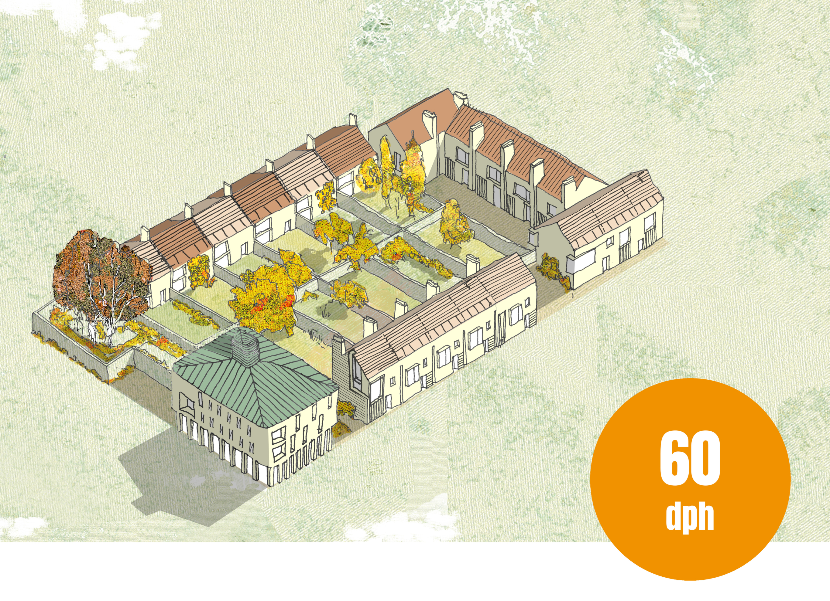 Axonometric drawings showing how the homestead model can be arranged to change the mix of typologies and tenure with densities ranging from 30 to 60 dwellings per hectare.
