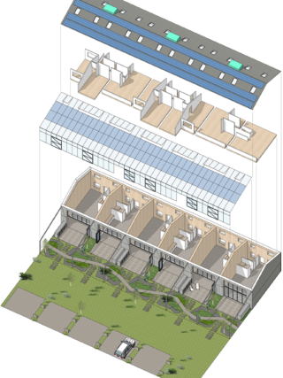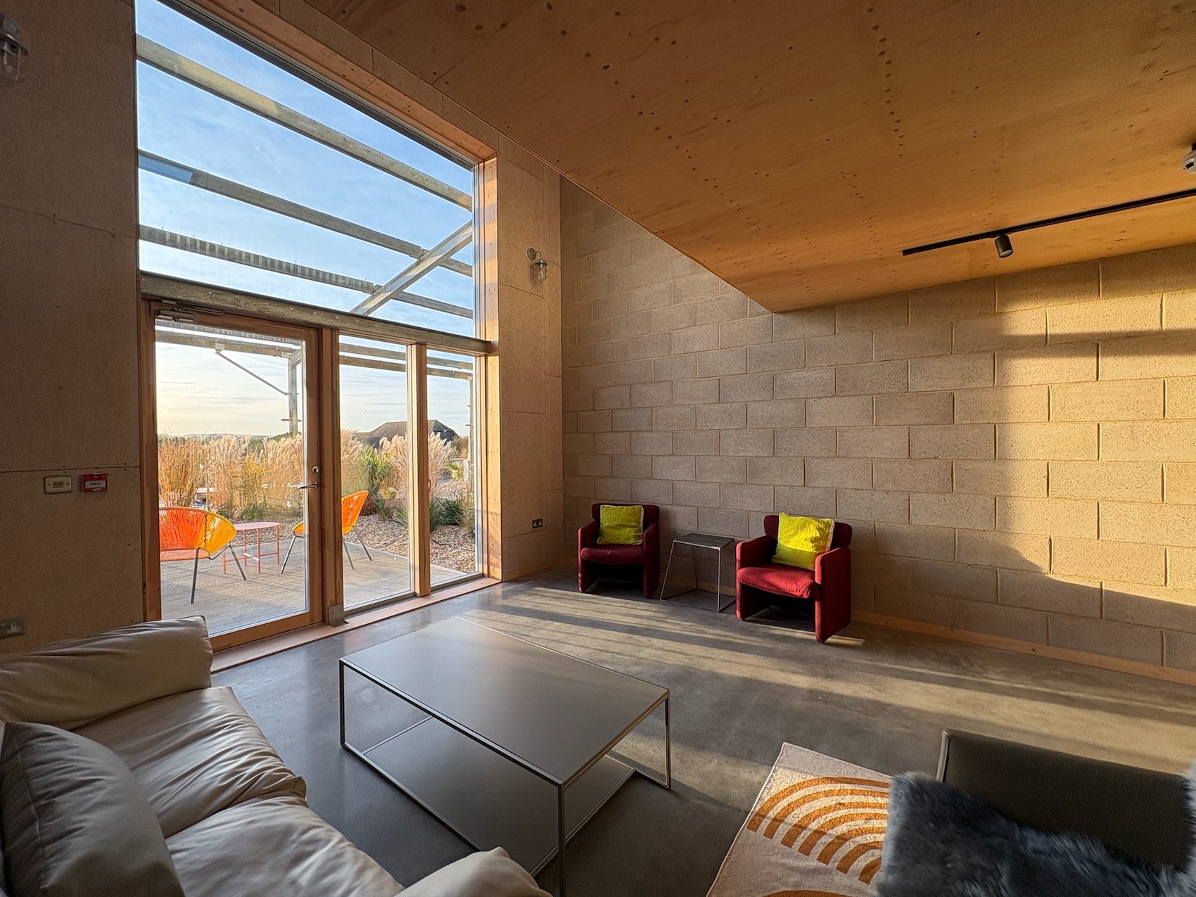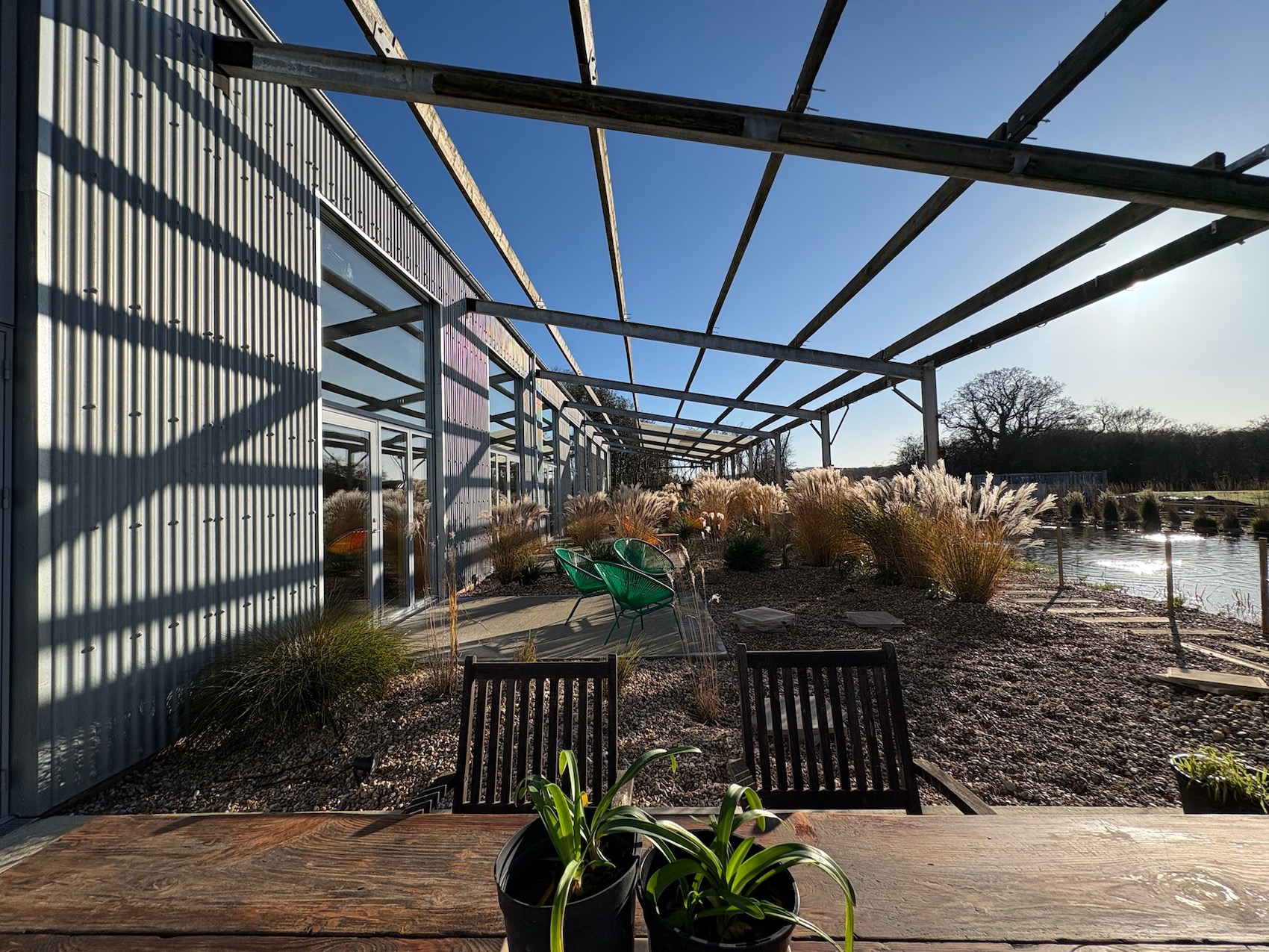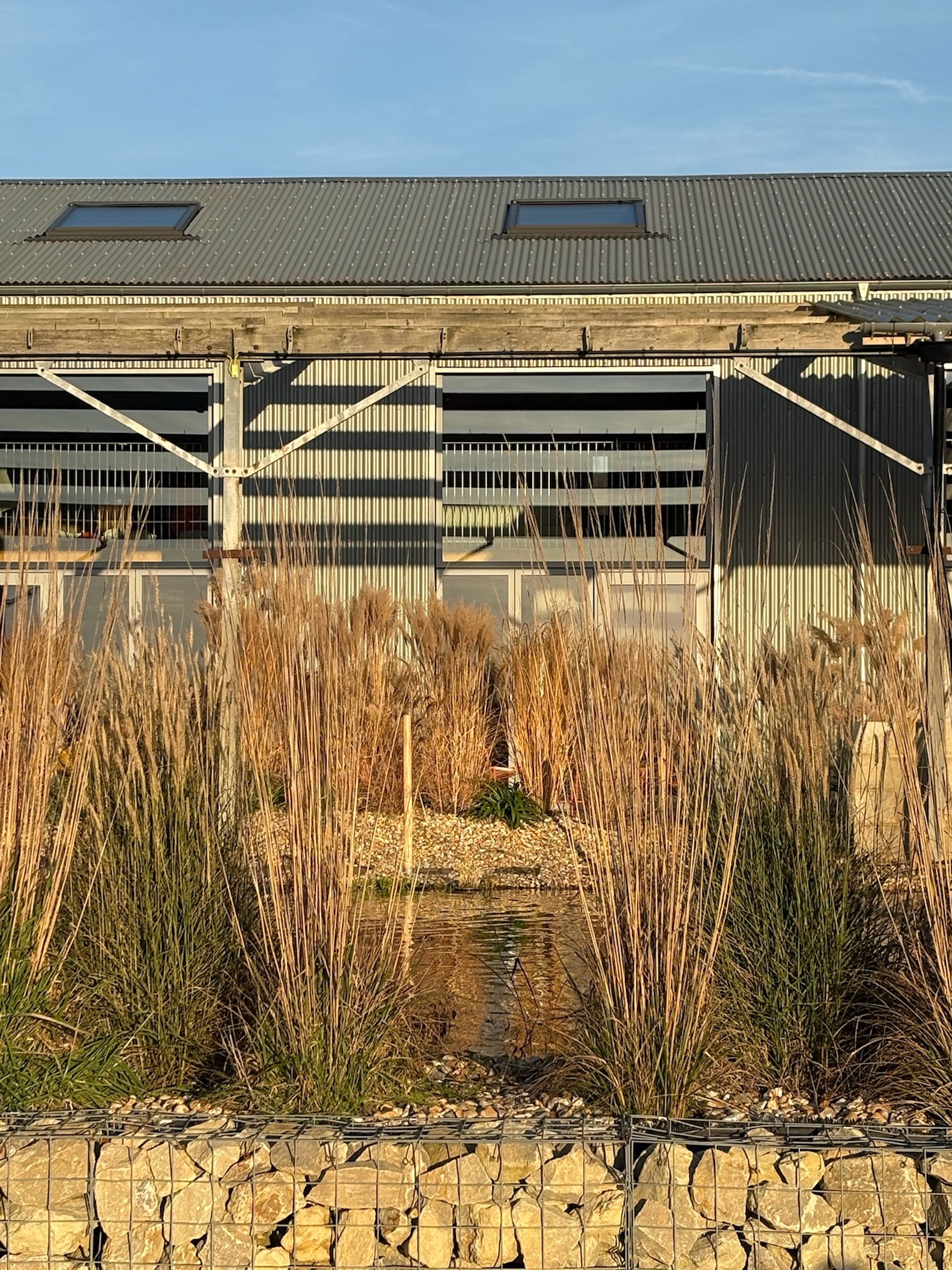 The site is organised around two principal structures: a large steel-framed barn and a former brick cow shed. The barn now contains six loft-style units, each opening onto a 20-metre natural swimming pond designed in collaboration with Ray Bates, a Chelsea Flower Show Gold Medal winner. The pond is both a visual focal point and a shared amenity – biologically filtered, rainwater-fed, and set within shingle-based, coastal planting intended to evoke the nearby Sussex coastline. Rather than pastoral nostalgia, the landscape references seaside ecologies, reinforcing the project’s hybrid agricultural-urban identity.