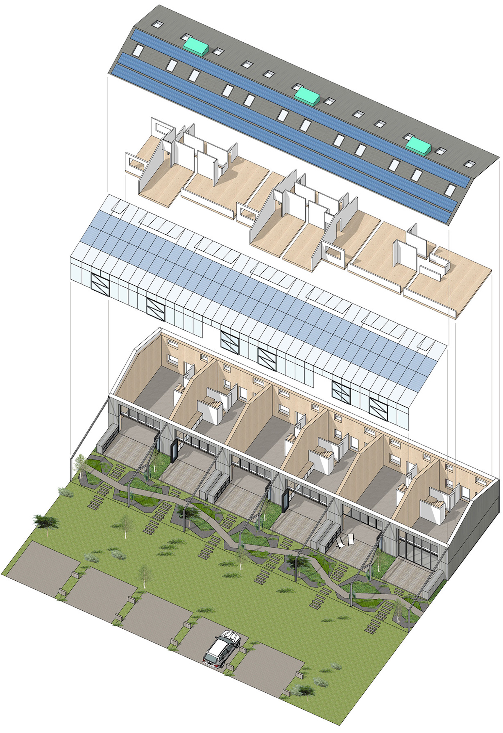 Environmental performance is embedded throughout the scheme. Each unit comprises a high-performance, airtight timber envelope, recycled wood-fibre insultation, triple glazing, mechanical ventilation with heat recovery (MVHR) and an air-source heat pump. The swimming pond is chemical-free and sustained by rainwater harvested from the roofs, filtered through aquatic plants. Across the wider site, wildflower meadows support seasonal biodiversity. The project’s development was guided by ecological input to protect native species, including great crested newts.