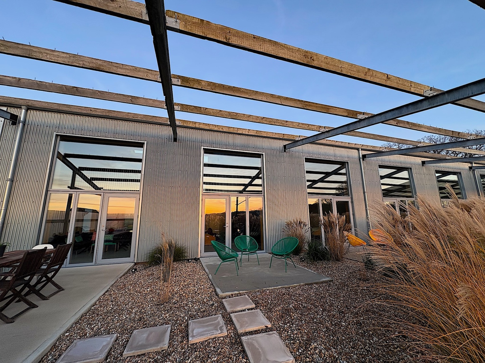 Materially, the project embraces a robust, utilitarian language. Corrugated steel, brushed metal, and exposed timber structural frames are deliberately juxtaposed with the softness of water, planting and light. Architectural lighting extends use into the evening, allowing buildings and landscape to function as a coherent communal environment. The interiors balance pared-back finishes with warmth and tactility.