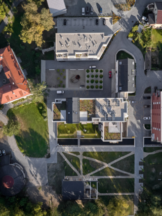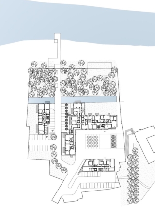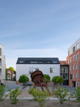A key urban move was the completion of the previously open sided U-shaped complex with a new three-storey residential building. This intervention defines a landscaped square oriented toward the castle and structured around a generous staircase. At its centre stands a recovered turbine, rediscovered in the filled-in water channel and reintroduced as a reminder of the site’s industrial past.
