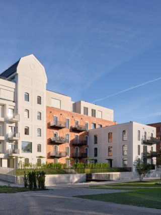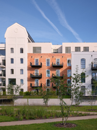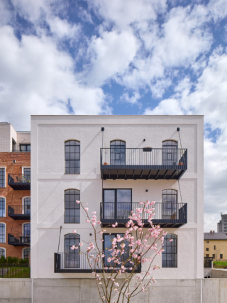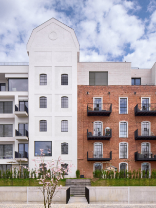 The former administrative building has been reconfigured as apartments, finished with a new brick plinth and light plaster façade. A contemporary glazed circulation core connects the historic structures, clearly expressing the distinction between old and new while improving accessibility.