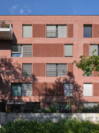 The two new buildings adopt contrasting but complementary architectural languages. One, enclosing the square, is a three-storey volume in light brick with white metal detailing, deliberately differentiated from the historic fabric. The other, positioned along the river and water channel, is a five-storey brick building whose regular façade and large openings establish a strong visual relationship with the landscape.