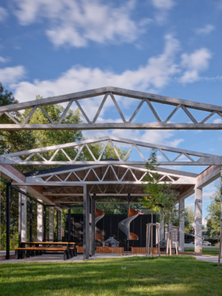 Reuse of the existing structures formed the foundation of the environmental strategy. Structural interventions were substantial, including the replacement of deteriorated timber elements with reinforced concrete slabs and the removal of redundant concrete silo bins, fragments of which have been retained as interior features. Green roofs and a rainwater management system further support the ecological performance of the scheme, supplying water to the restored channel.