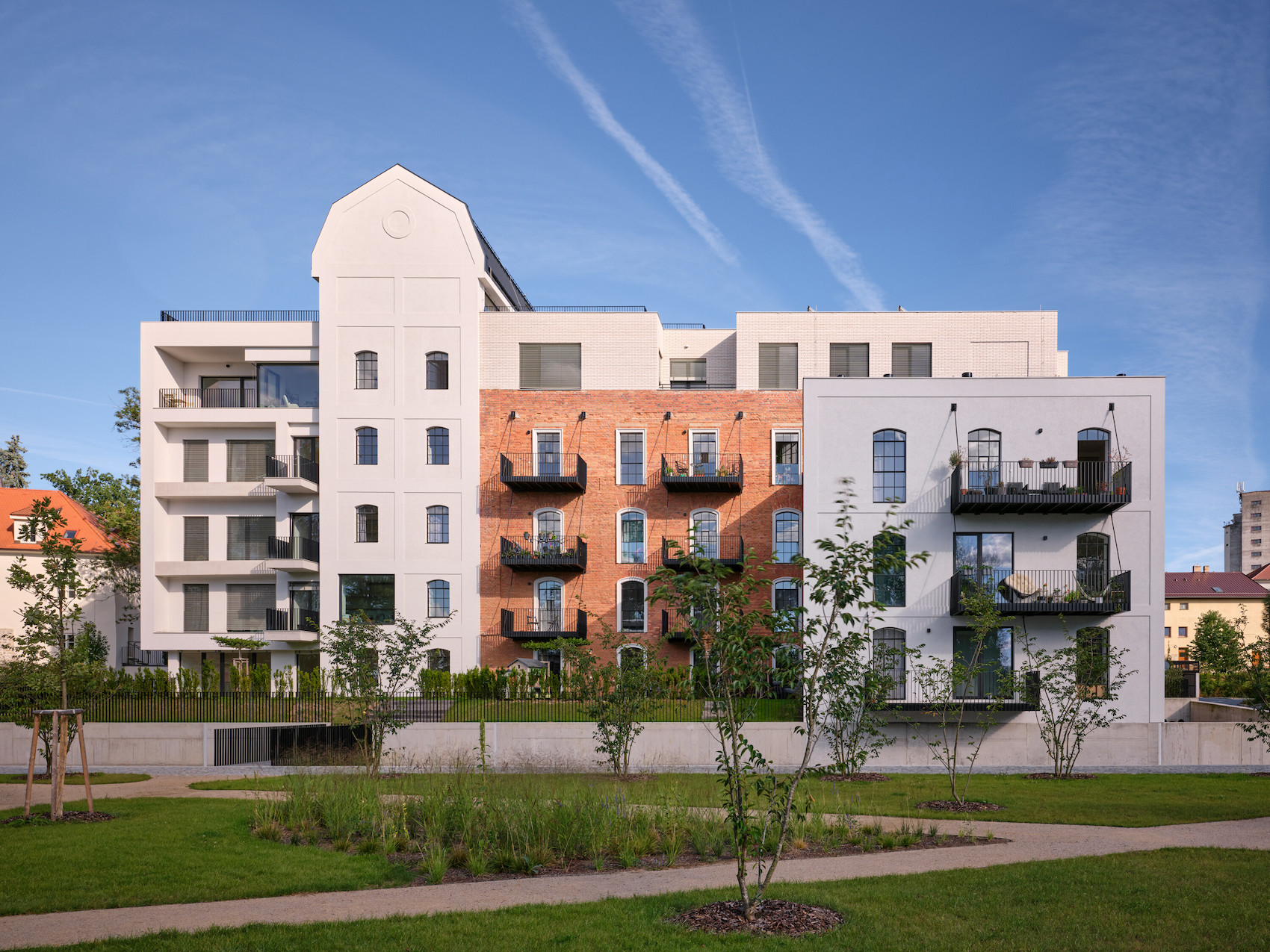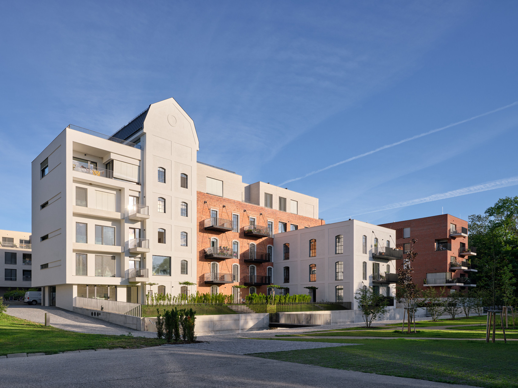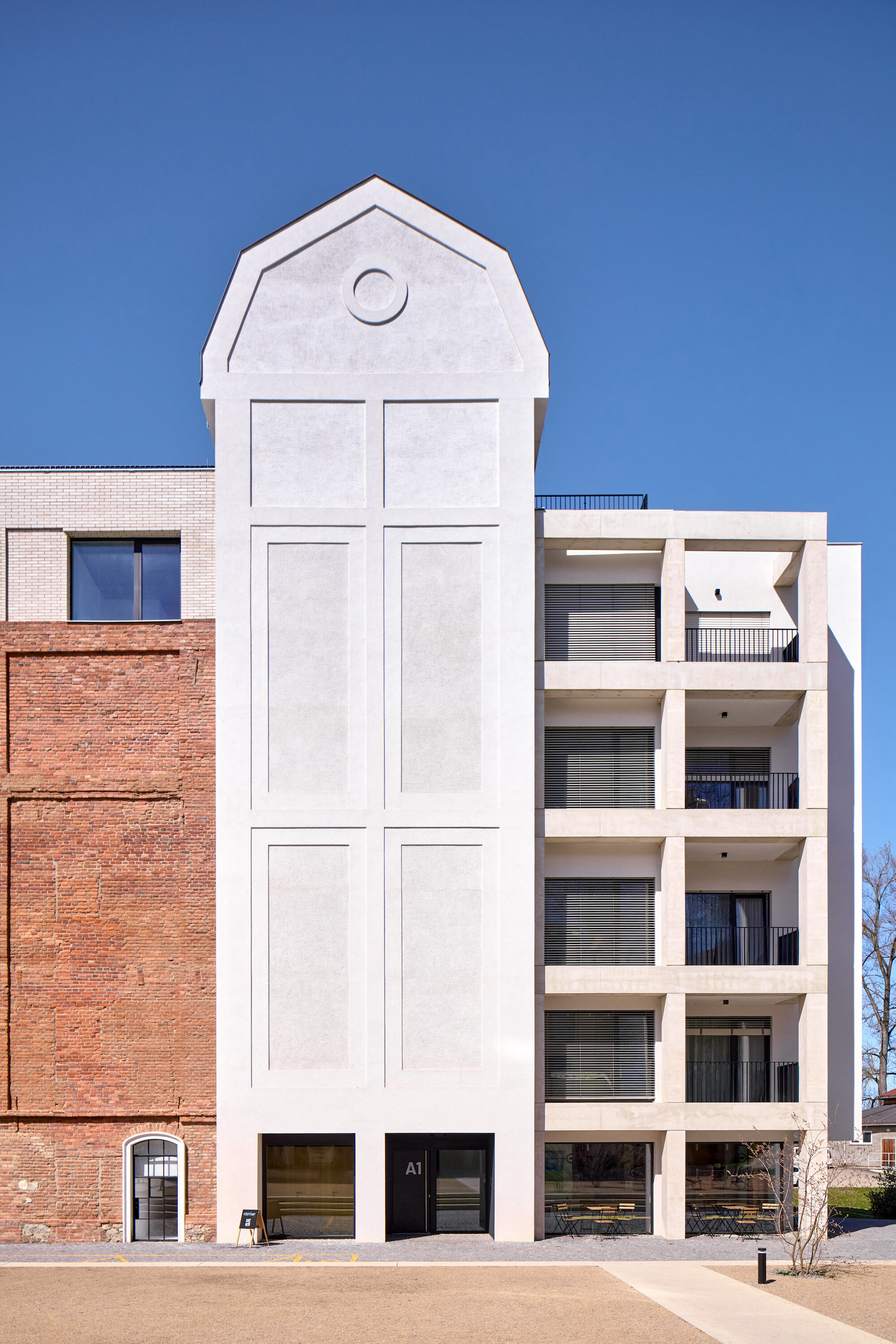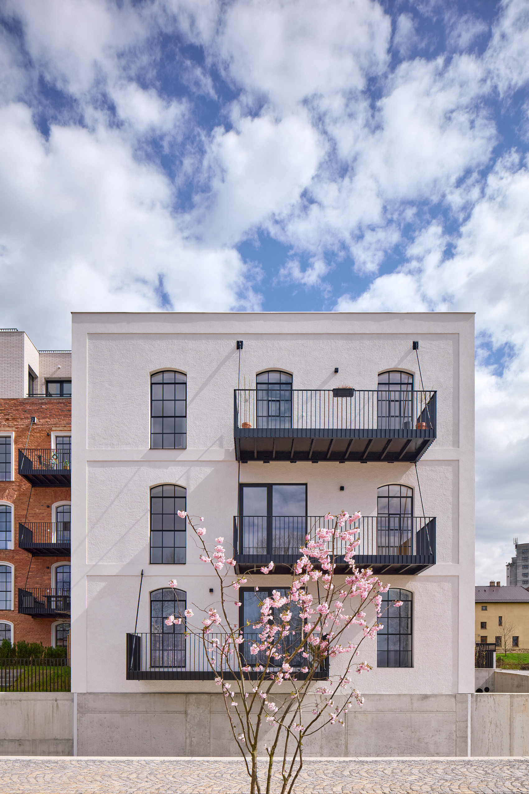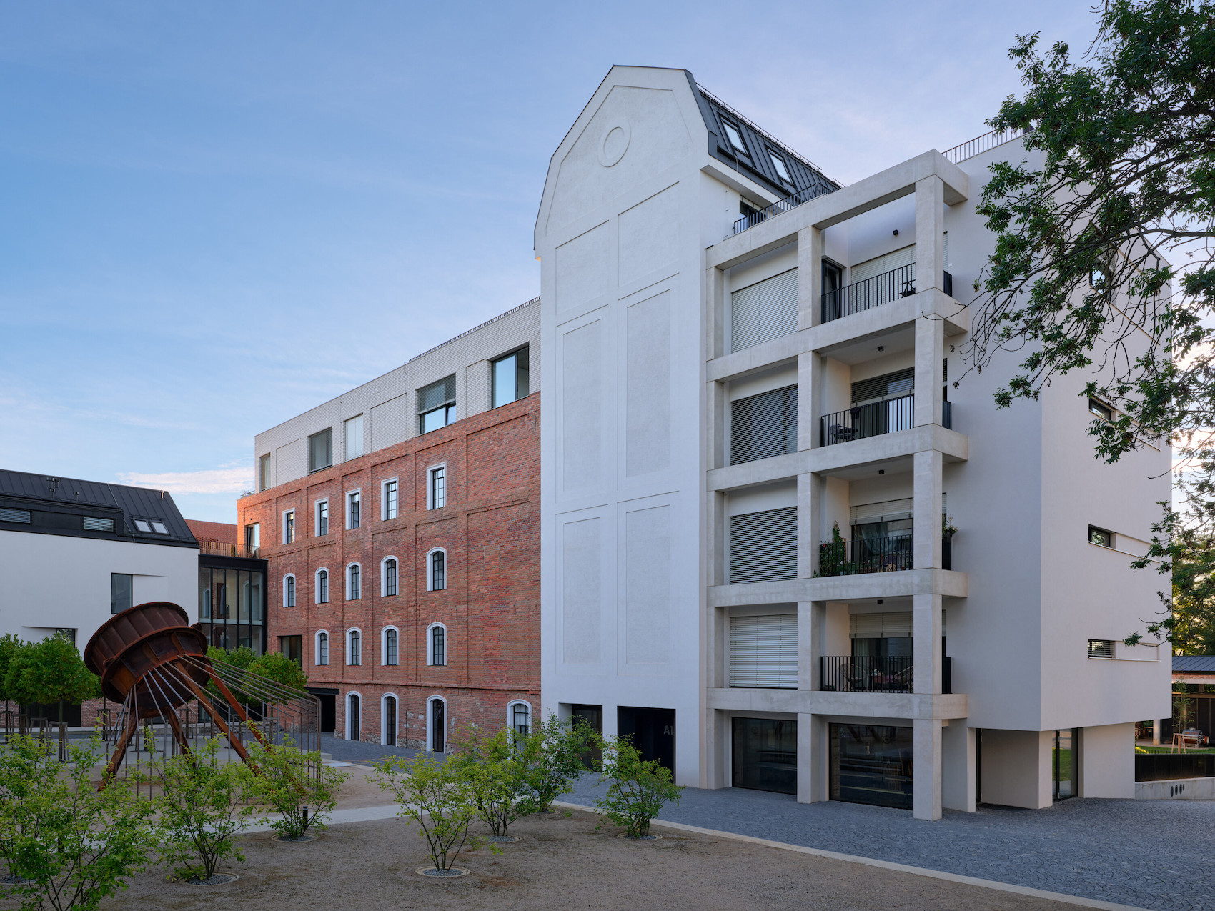 The former administrative building has been reconfigured as apartments, finished with a new brick plinth and light plaster façade. A contemporary glazed circulation core connects the historic structures, clearly expressing the distinction between old and new while improving accessibility.