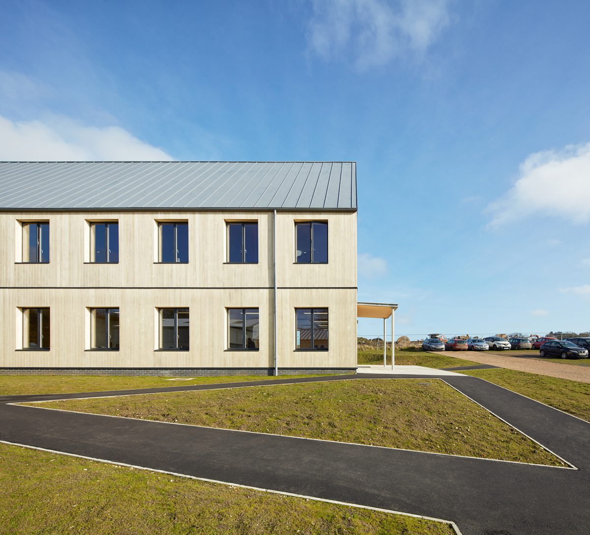 Designed to Passivhaus principles, the Christies Care office building in Saxmundham, Suffolk, by Nicholas Hare Architects is constructed predominantly from cross-laminated and glulam timber. Accommodating around 60 people, the 484-square-metre structure is conceived as a simple two-storey box with a pitched roof. The primary axis runs north-south with deeper, open-plan offices located on the west side of the plan. To the south is a cafe, which is daylit by a generous glazed screen and protected from solar gain by a deep canopy. An opening circular window in the south-facing gable allows a disk of sunshine to track across the first-floor office, and helps purge hot air in the summer.