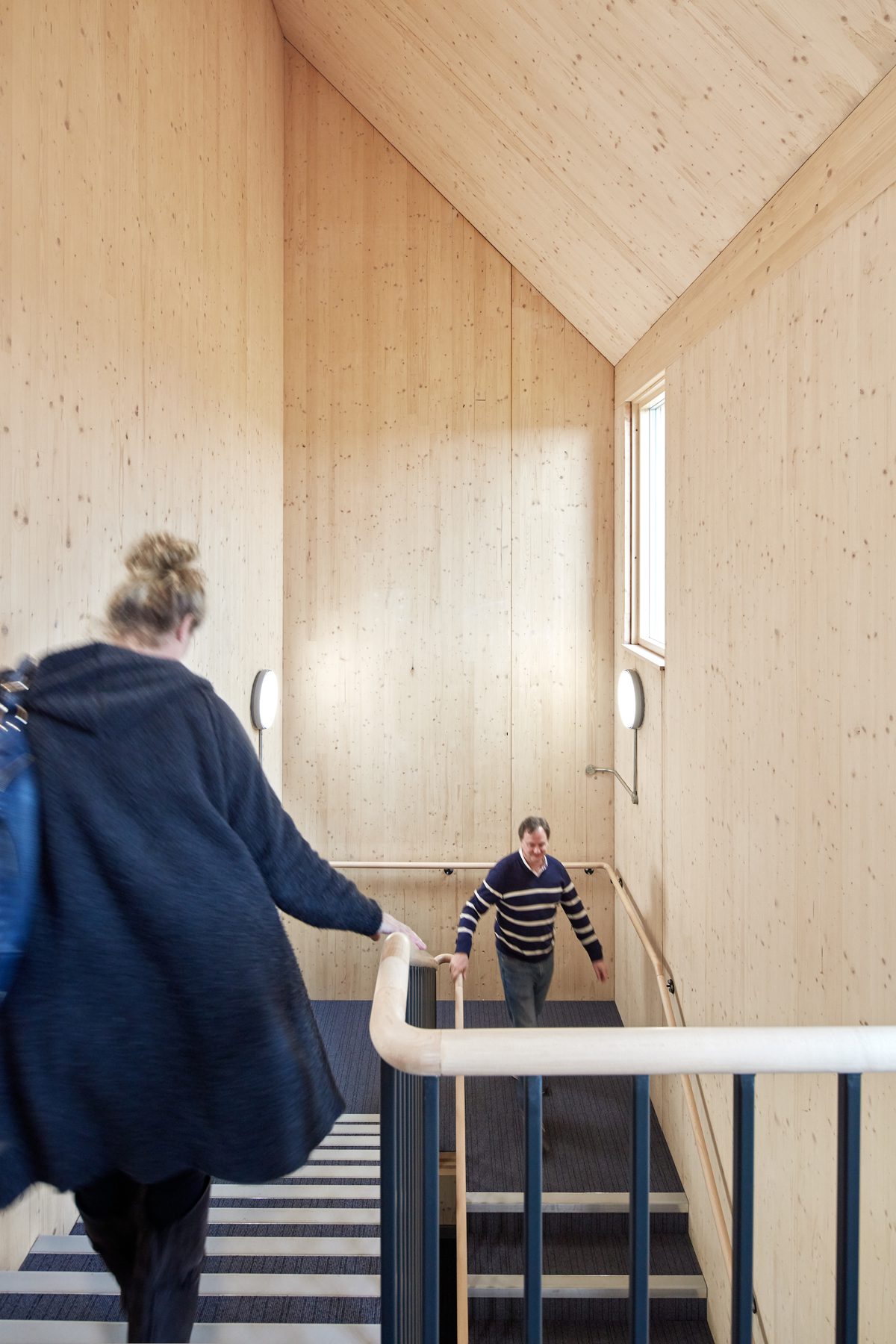Sealed to achieve class-O spread-of-flame, the CLT components are generally exposed inside the building. Specialist subcontractor Eurban produces three quality grades for interior CLT. Here, the most basic industrial quality was chosen in the expectation that any flaws would not detract from the overall aesthetic. A diluted white coating was applied to the surface to reduce the effects of the timber darkening over time.