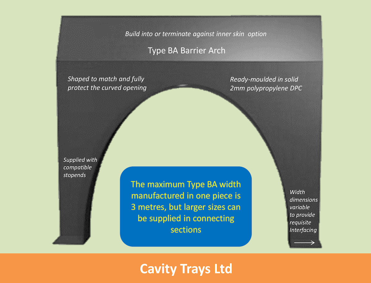 The advantages are amplified further when the opening head is not horizontal, but curved. Preformed arched Cavitrays match exactly the opening radius, providing protection at intrados level, and discharge offset along the springing line. Where numerous arches are in such close proximity that pinch-points are created into which large volumes of penetrating water would normally gravitate, Cavity Trays Ltd has arresting trays to prevent overwhelming.