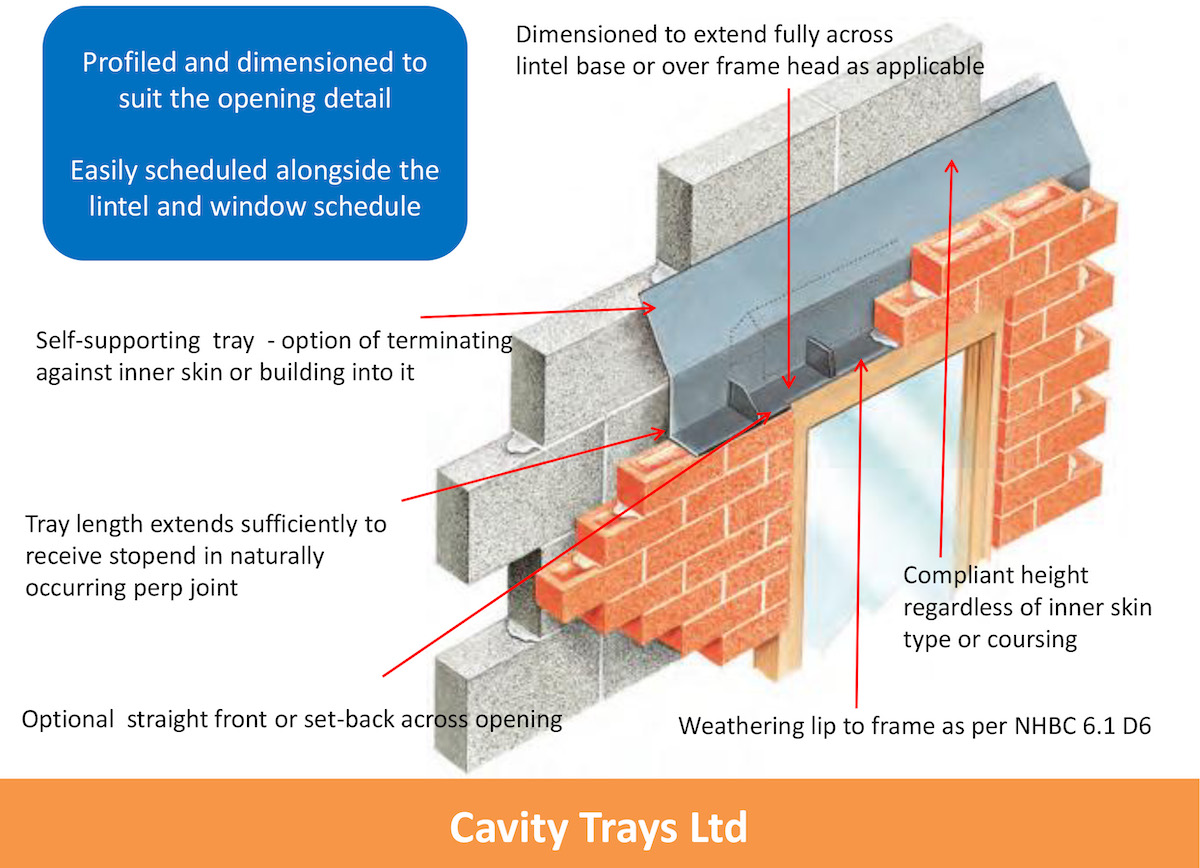 Using a preformed solid DPC Cavitary offers many benefits, at design stage and during physical construction. Scheduled alongside lintel and window schedules, preformed trays are supplied ready-moulded to suit the opening arrangement so consistent compliant protection is assured every time. Trays are also self-supporting, so seeking that bed course in the inner skin is eliminated.