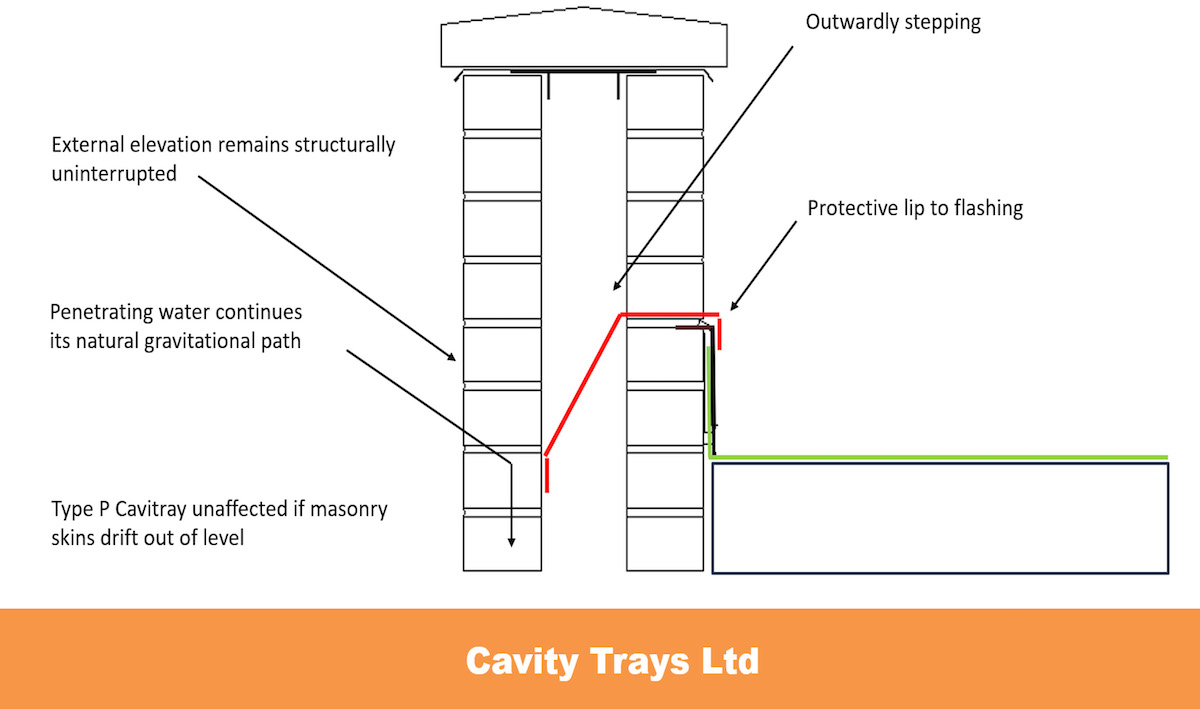 Control of penetrating water is also an important aspect at higher levels – the parapet wall being a good example. A parapet has both masonry skins exposed to the elements and should be accompanied with an understanding the internal DPC configuration always steps downwardly and outwardly. Unfortunately PD 6697 advises it may step inwardly if there is no cavity insulation present. This is considered incorrect guidance as stepping inwardly exposes the structures’ elevation to wet penetrating and under-tracking the inward-step, especially where cracking occurs long the bedding course – a common occurrence because both high-level skins are structurally separated from the masonry under! Using preformed Cavitrays that step outwardly prevents under-tracking, and Type P parapet trays are also self-supporting, so banish the need to build into the elevation skin which remains structurally uninterrupted.