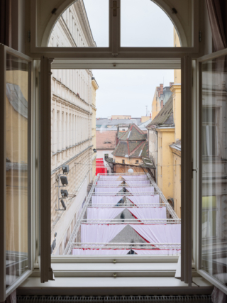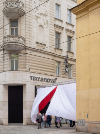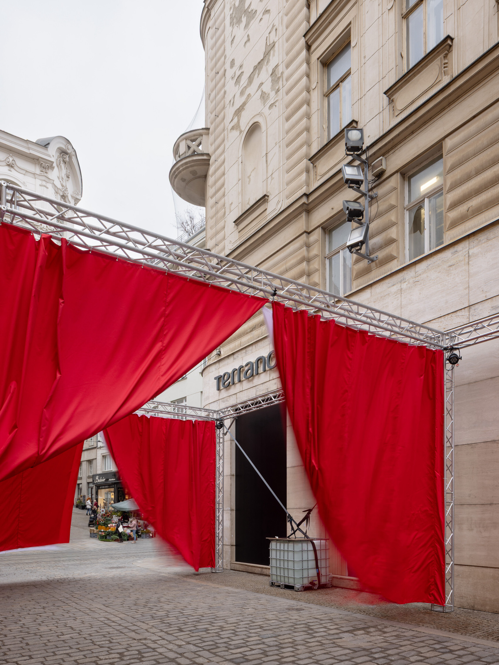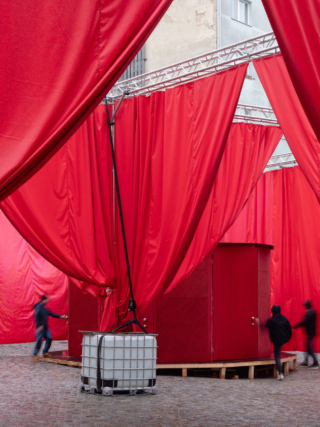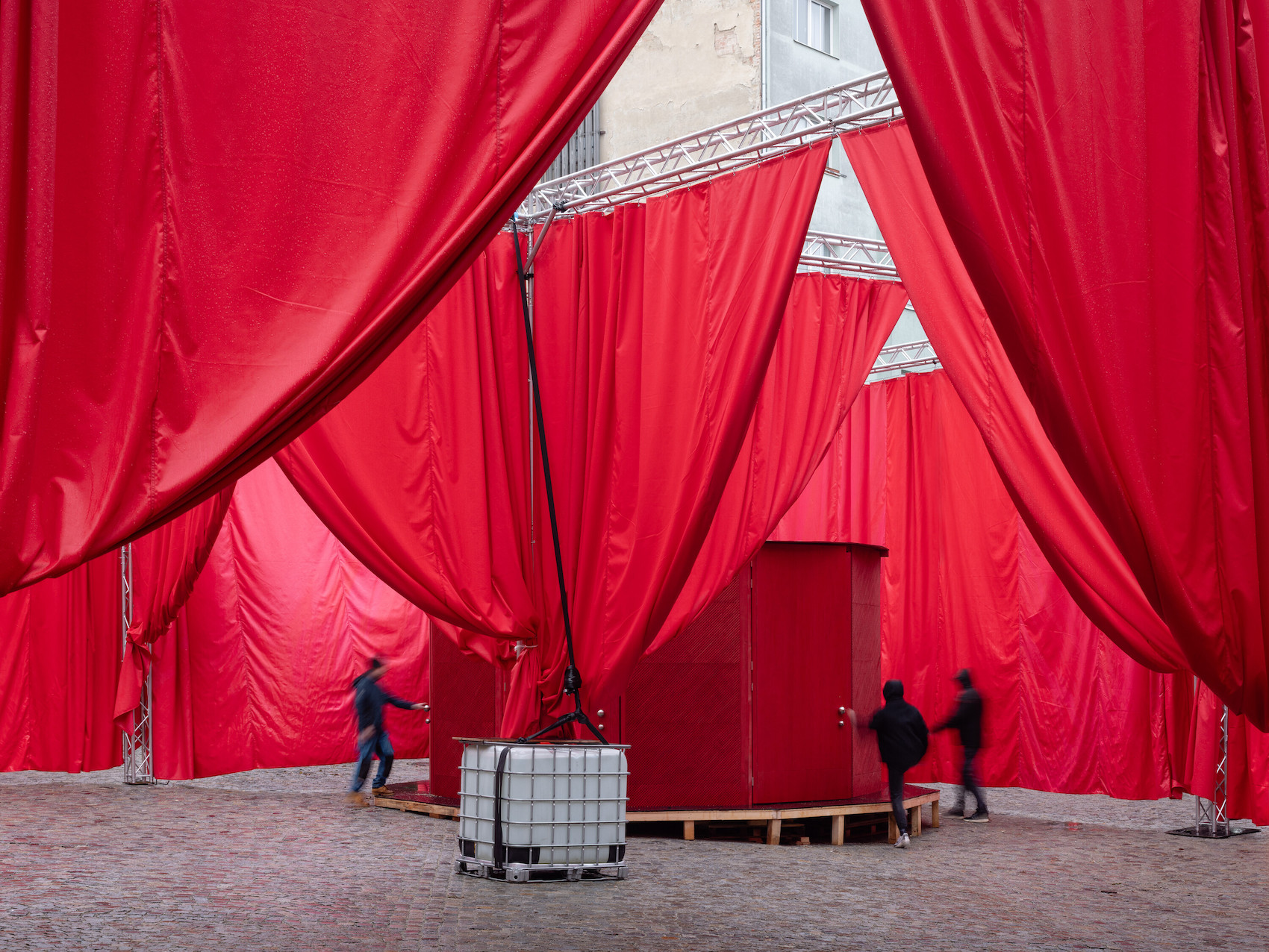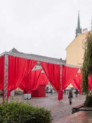A 2,478-square-metre network of suspended red and white curtains hung from modular stage trusses divide the festival site into 18 interconnected ‘rooms’. The visual simplicity of the fabric partitions belies a richly layered experience: the structure doubles as an urban gallery at night, with ambient sound and projected testimonies from Šedá’s ongoing social archive, The National Collection of Bad Habits.