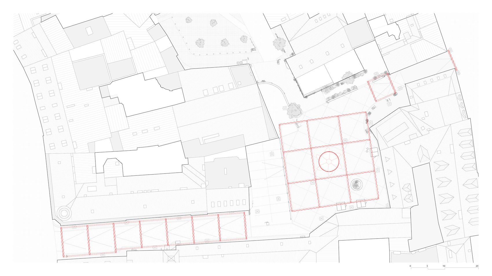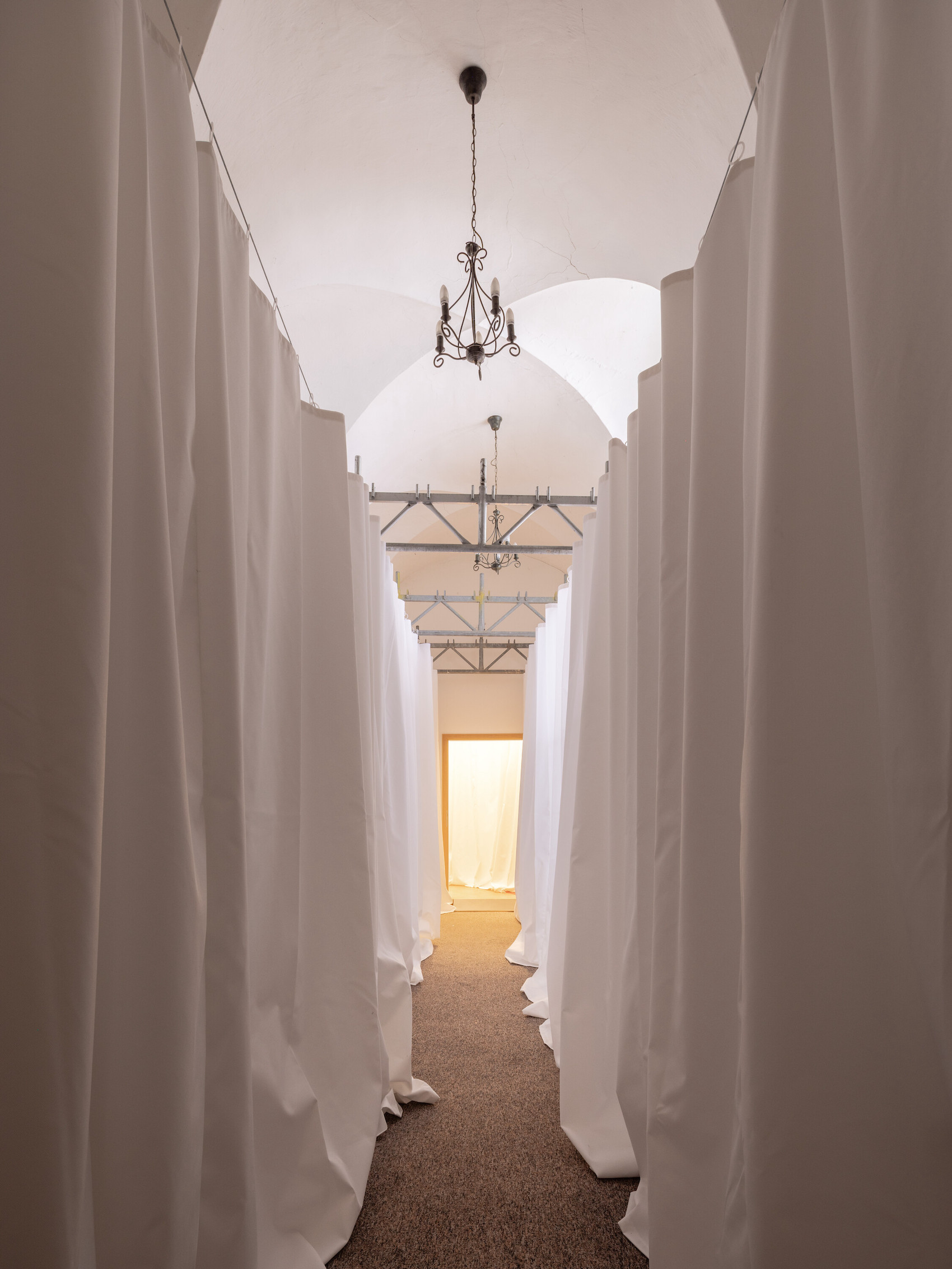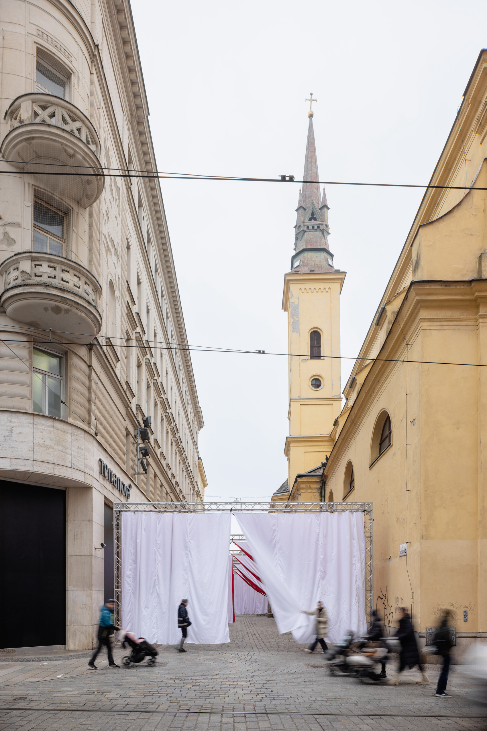 A 2,478-square-metre network of suspended red and white curtains hung from modular stage trusses divide the festival site into 18 interconnected ‘rooms’. The visual simplicity of the fabric partitions belies a richly layered experience: the structure doubles as an urban gallery at night, with ambient sound and projected testimonies from Šedá’s ongoing social archive, The National Collection of Bad Habits.