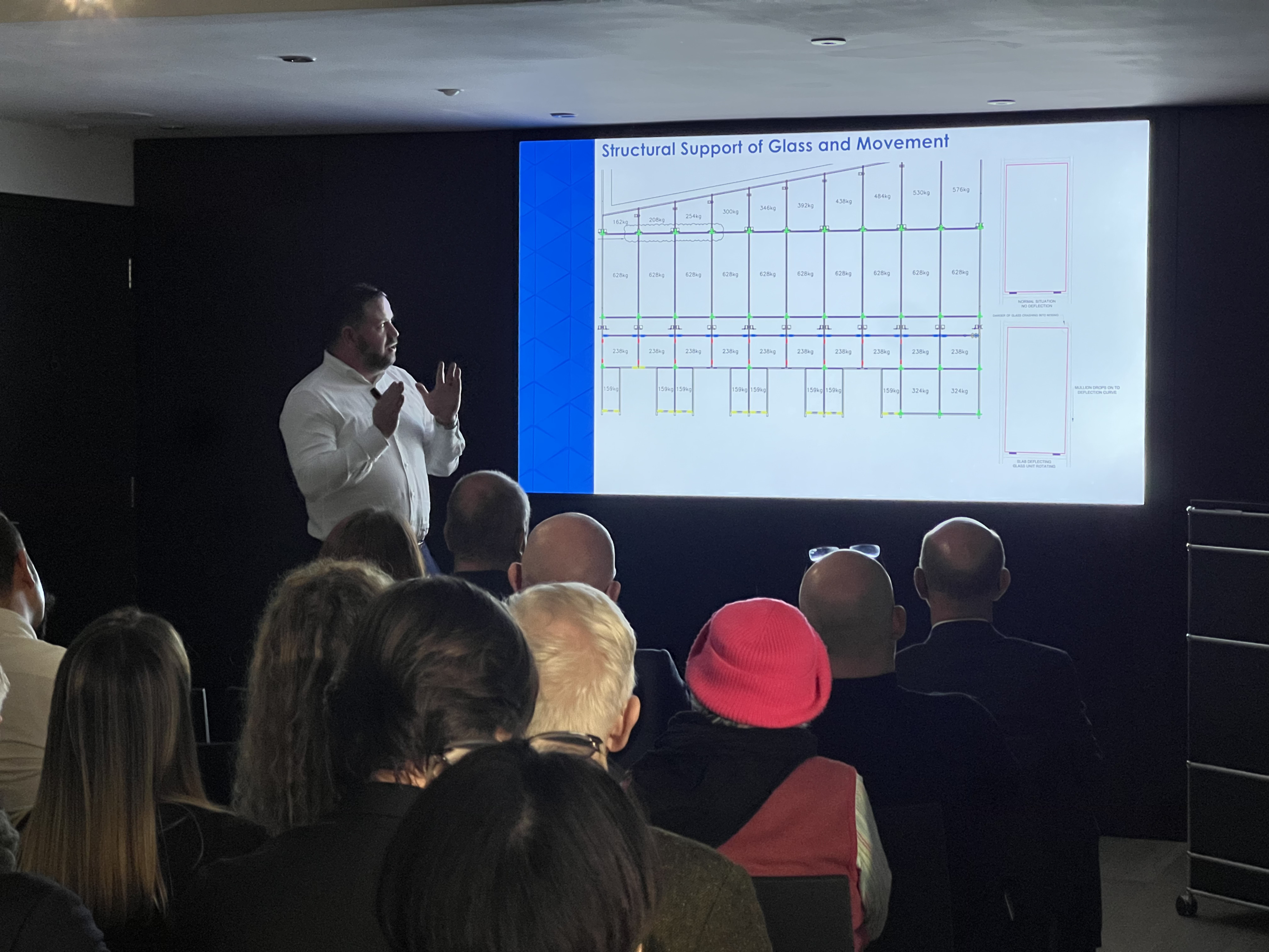 Barrett provided a detailed account of the façade engineering, illustrating the complexity behind apparently simple forms. A single curtain-wall elevation measuring 147 metres in length required accommodation of significant thermal movement, bespoke structural solutions around large door openings, and integrated drainage systems within visually minimal profiles. Some individual glass panels weighed more than 600 kilograms, demanding precise structural coordination and installation strategies.