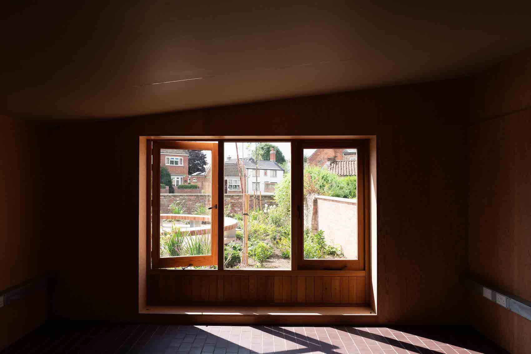 An existing single-storey extension to the hall has been removed – to create a fire escape – and replaced with a soft-planted garden, circular timber bench, and entrance pathway. The existing lean-to entrance extension has also be removed and replaced with a pitched roofed entrance, whose form reflects the gable of the existing hall. A large gable window provides views onto the communal garden.