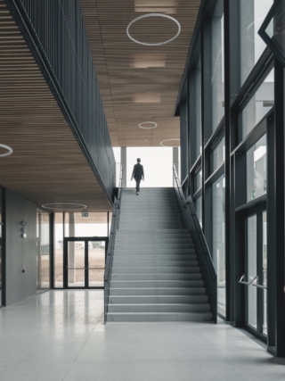 The auditorium, study room, and cafeteria employ wooden slat flooring, while classrooms have been equipped with a rubber floating floor and with a neutral sound-absorbing suspended ceiling. An atrium and further circulation spaces employ large grey Venetian terrazzo slab, complemented by dark grey walls and a wooden slat ceiling.