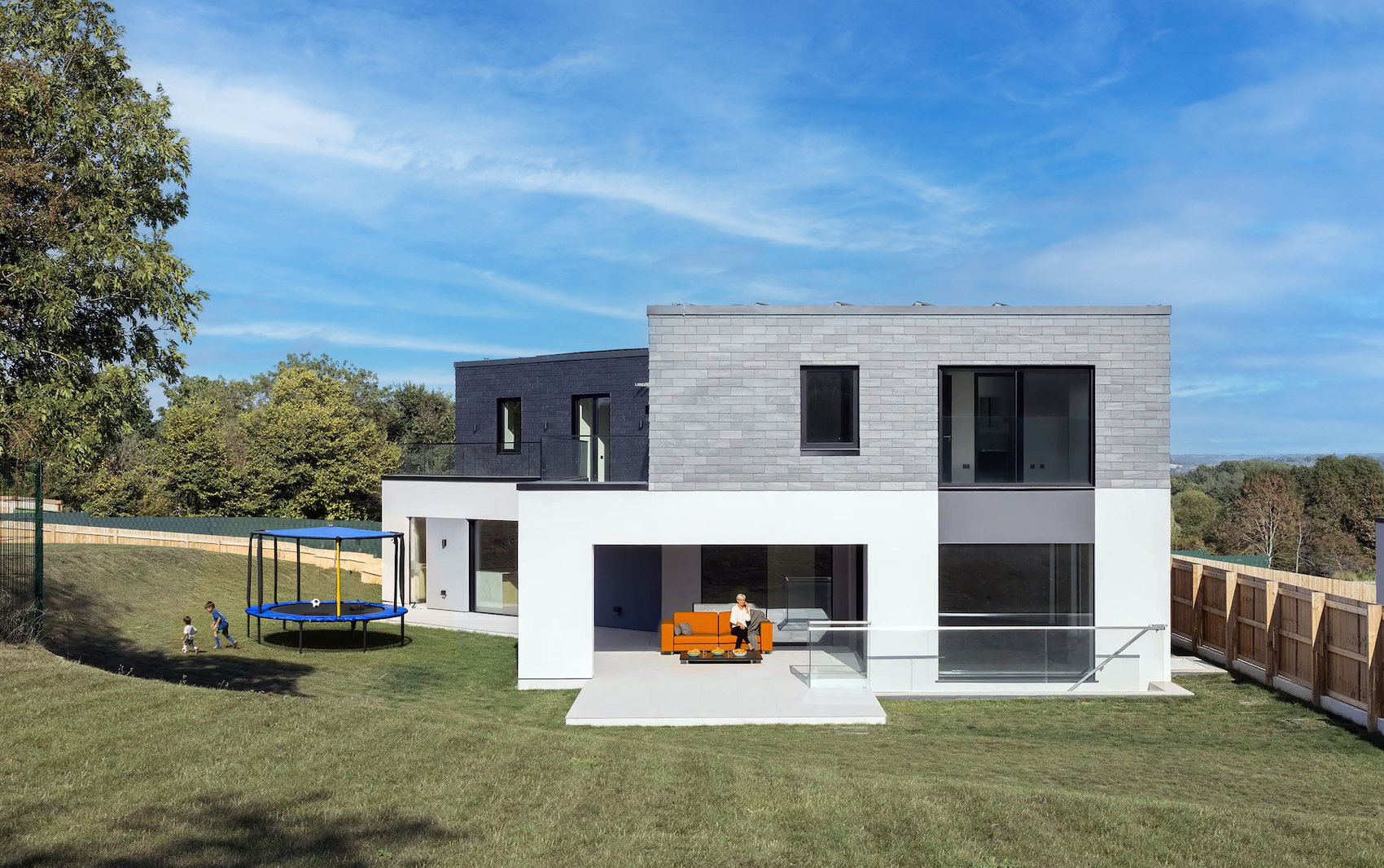 The use of natural slate was key to achieving the planning and aesthetic objectives of the scheme. Its dark, textured finish allows the upper storey of the building to recede visually, reducing its impact within the Green Belt setting while maintaining a strong architectural identity.