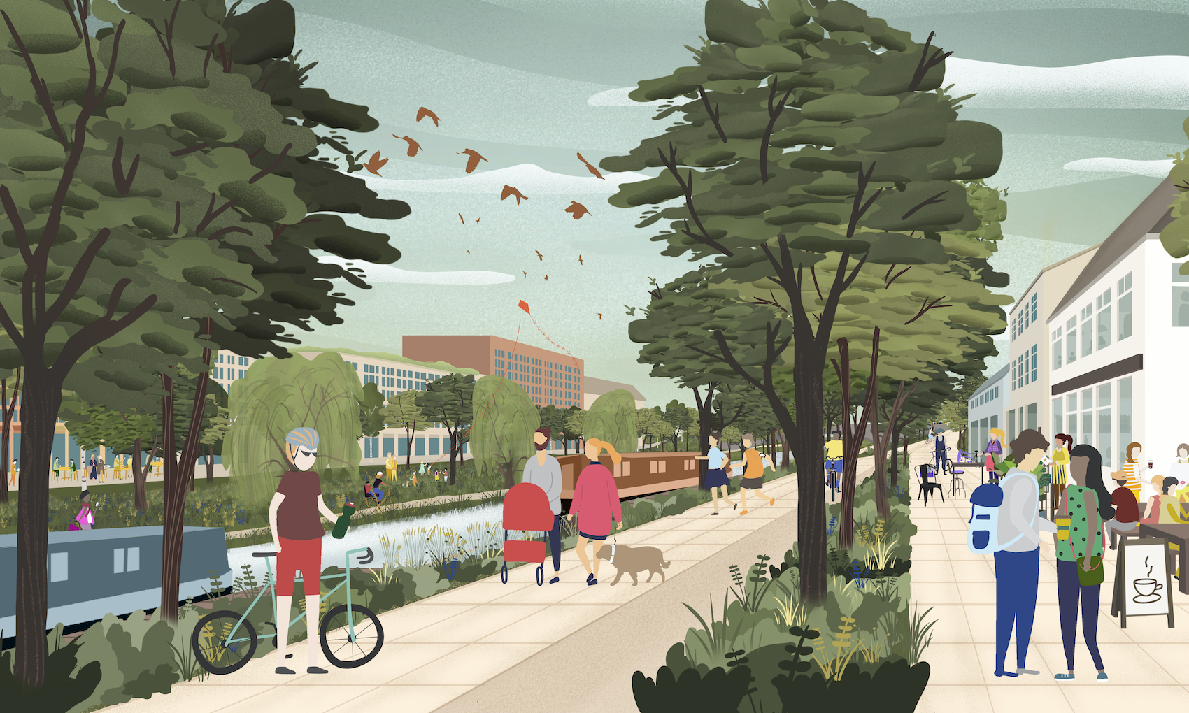 Biodiversity enhancements and urban greening are the backbone to the Framework. The site is currently predominantly hard-standing, and the Framework sets out substantial improvements. The Camac River runs through the site, including some tributaries, and is culverted for much of its length. The Framework proposes to de-culvert and re-naturalise the river, creating new linear green spaces along its length, whilst introducing major new parks. A linear green space is also created along the Grand Canal, and a strategy exists for street greening that goes beyond current policy.
