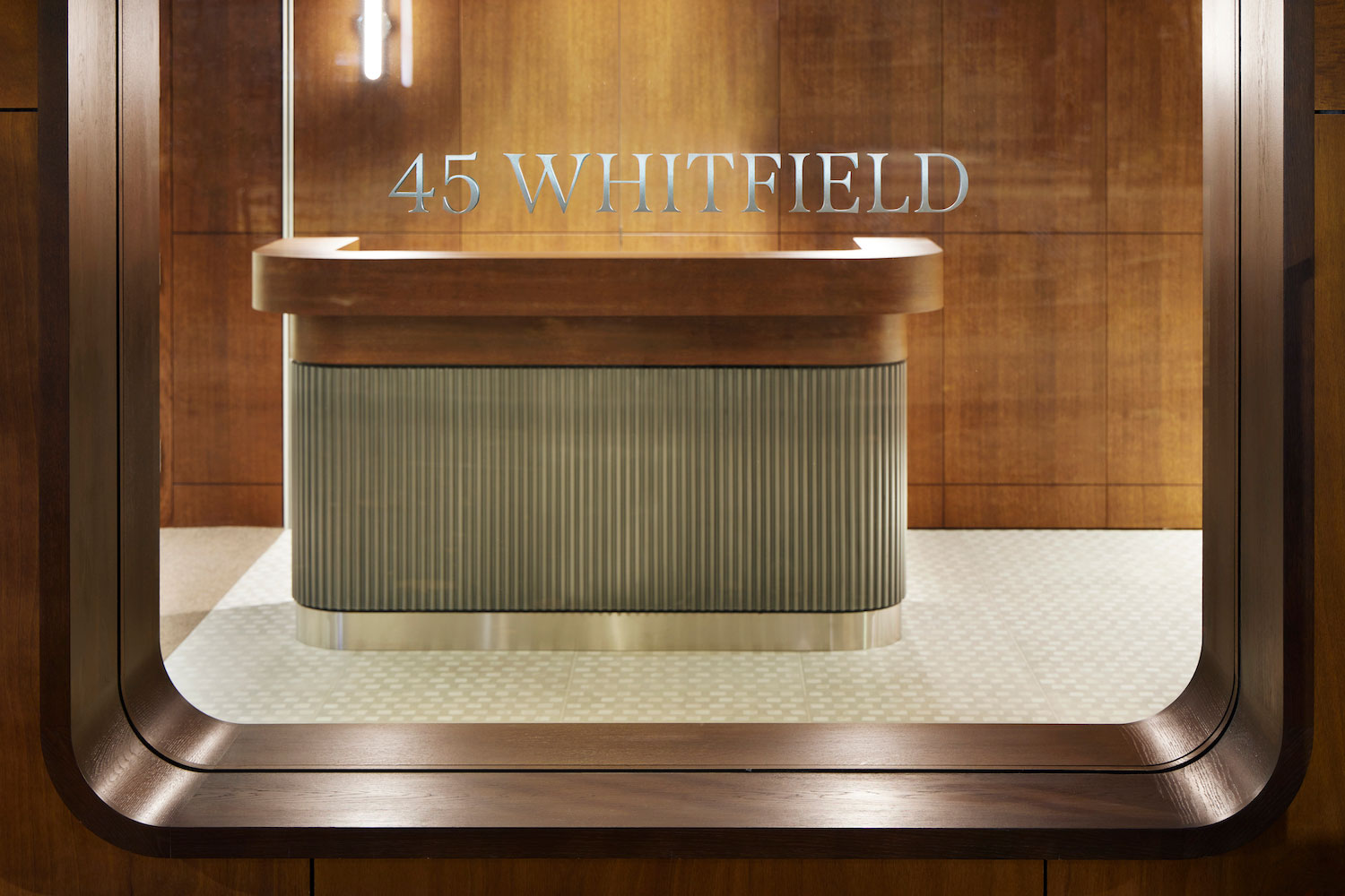 High-quality finishes inspired by the as-mentioned existing features of the building were integrated to enhance warmth and tactility. Joinery influenced by the timber lozenges of the distinctive windows at 45 Whitfield Street and a well-defined precast concrete façade have been incorporated. Recycled timber scraps, meanwhile, have been sourced from disused sawmills and repurposed as countertops, complementing the building’s dark timber surroundings and new terrazzo-style tiling, while maintaining the look and feel of the building’s ‘70s roots.