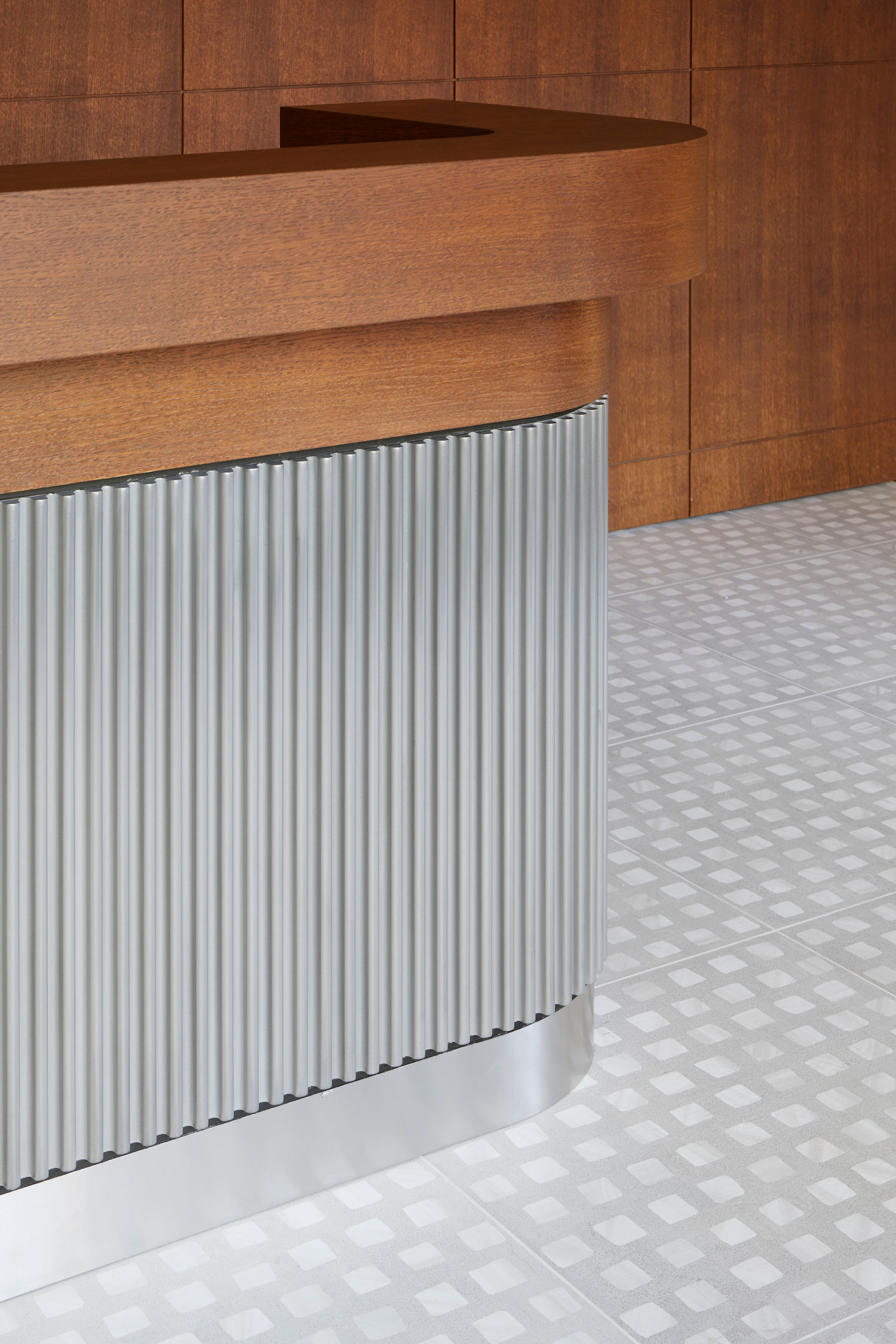 “The lozenge shaped precast concrete façade panels, original sapele window linings and stainless-steel façade panelling have informed the design of new bespoke curved timber entrance doors and reception frontage, crafted to add warmth to the raw palette of concrete and steel,” he added.