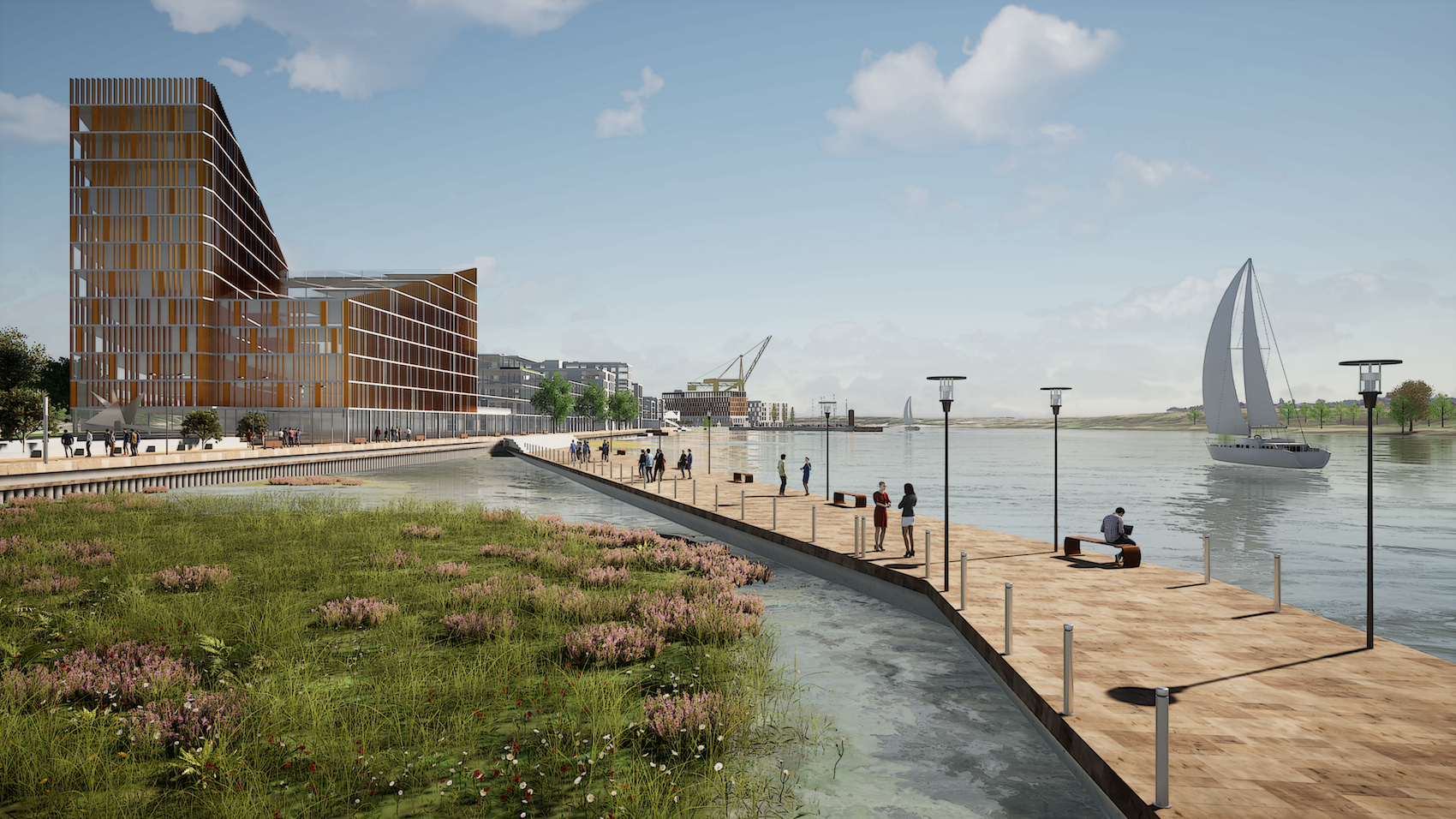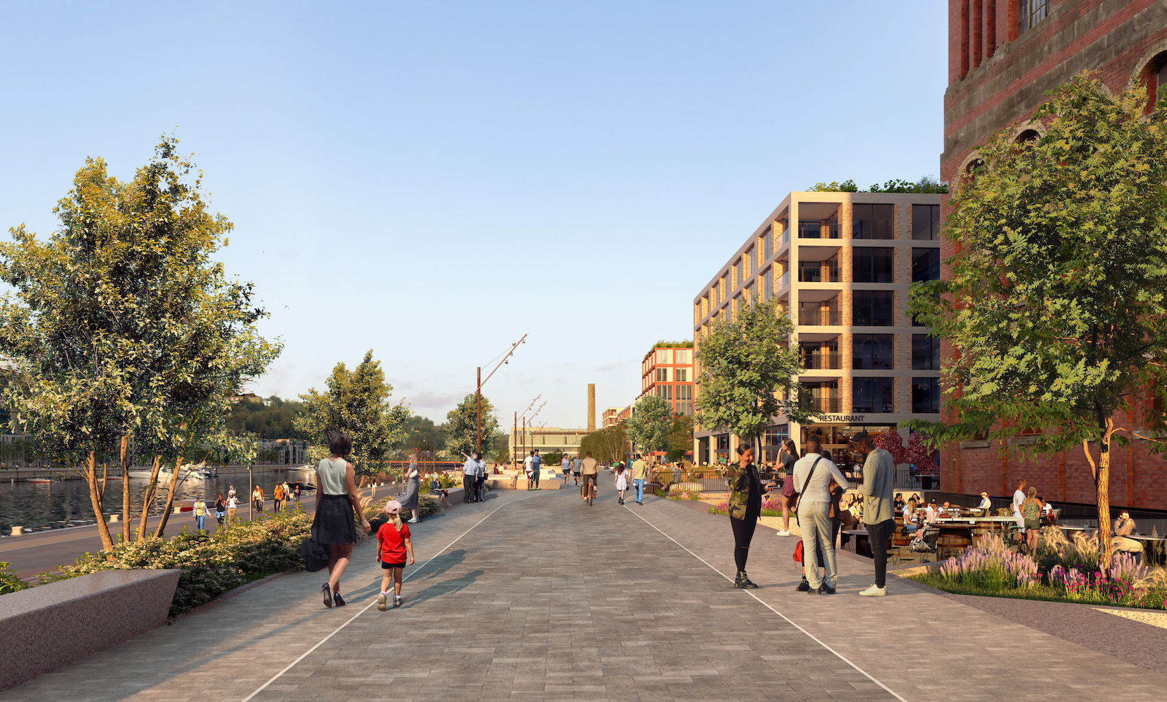 Reddy Architecture + Urbanism’s Tivoli Docks masterplan, Port of Cork, covers 62 hectares and is aiming at creating a vibrant city quarter for 11,000 residents and 4,000 workers. It includes a continuous public waterfront, river vistas, and a central staggered boulevard to maximise connectivity, street frontage and views (cgi: Reddy Architecture + Urbanism).