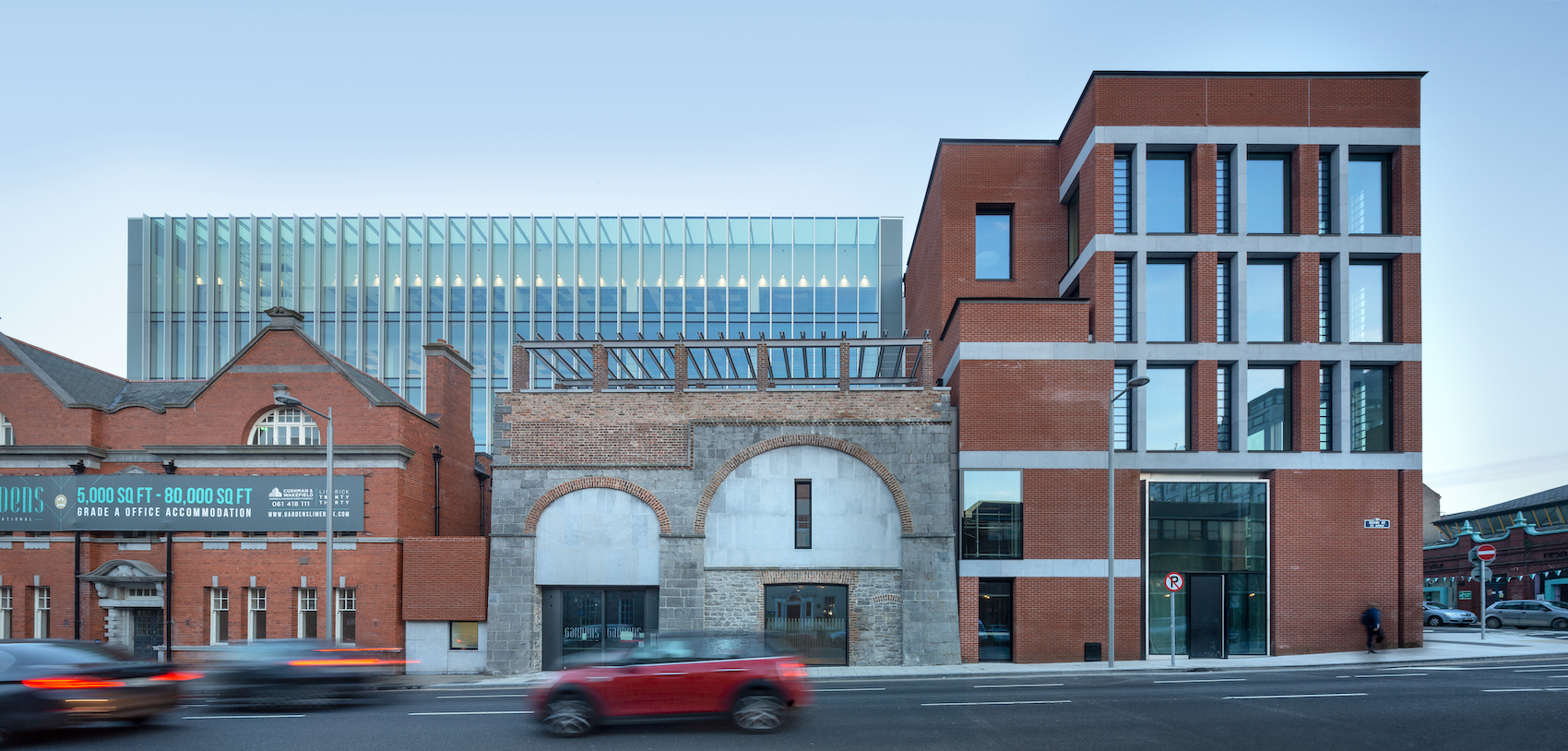 Cotter & Naessens Architects has led the transformation of the historic Hanging Gardens site in Limerick, once home to William Roche’s 19th-century stone vaults and terraced gardens. The Gardens International project unites restored vaults and former post office buildings with a new office development, creating a mosaic of old and new at the heart of Newtown Pery (photo: Paul Tierney).