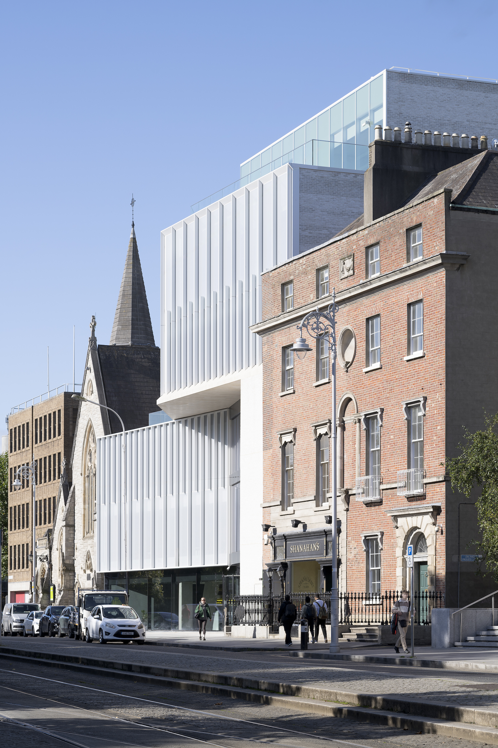 The new School of Population Health continues this transformation of the RCSI’s historic estate, weaving teaching, labs, and public engagement spaces into a constrained site framed by protected structures and the Unitarian Church. A serrated façade folds back to reveal the church spire, while a diagonal atrium aligns with its north-facing window, bringing light deep into the plan. The building stacks labs above faculty and teaching spaces, threaded by a stair that climbs diagonally to the top floor and opens views to the Green. McGovern emphasised that the project is about vitality and connection: creating collision spaces for students and researchers, establishing a new front door to the campus, and reinforcing the RCSI’s ambition to attract world-class talent, while remaining embedded in the fabric of the city.