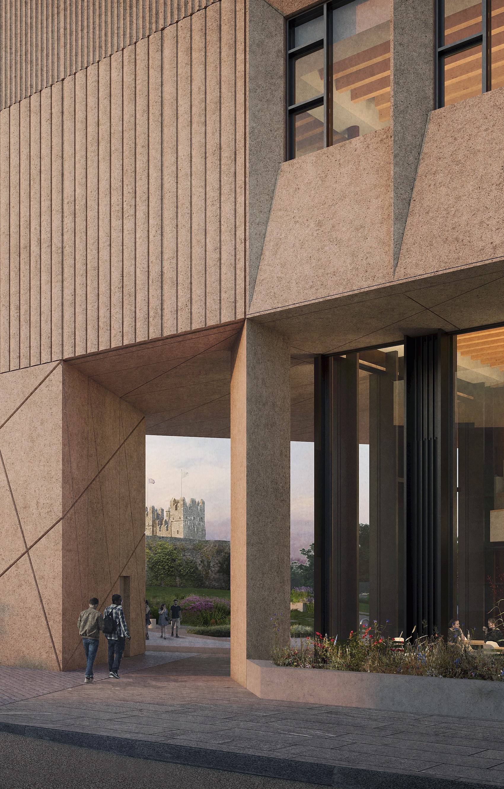 Due to complete in 2026, Culture House Swords by O’Donnell + Tuomey is a new public library, theatre and gallery for Fingal County Council in Swords town centre. The project includes a new civic space, designed to complement the historic castle setting at the end of Main Street (cgi: Picture Plane).