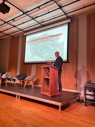 Next up, Colin Mackay, Partner at Hawkins\Brown, presented Cork Docklands Masterplan, a 147-hectare regeneration scheme described as Ireland’s largest single urban project. The framework represents a decisive shift from outward sprawl to inward-focused growth, with capacity for 10,000 homes, 25,000 jobs, three schools, cultural and community facilities, and an extensive public realm. Mackay noted that the project is designed to deliver enabling infrastructure rather than prescribe building form. Key investments include a €1bn package of light rail, BusConnects corridors, three new bridges, and flood resilience measures, all intended to “facilitate development, not drive development in itself.”