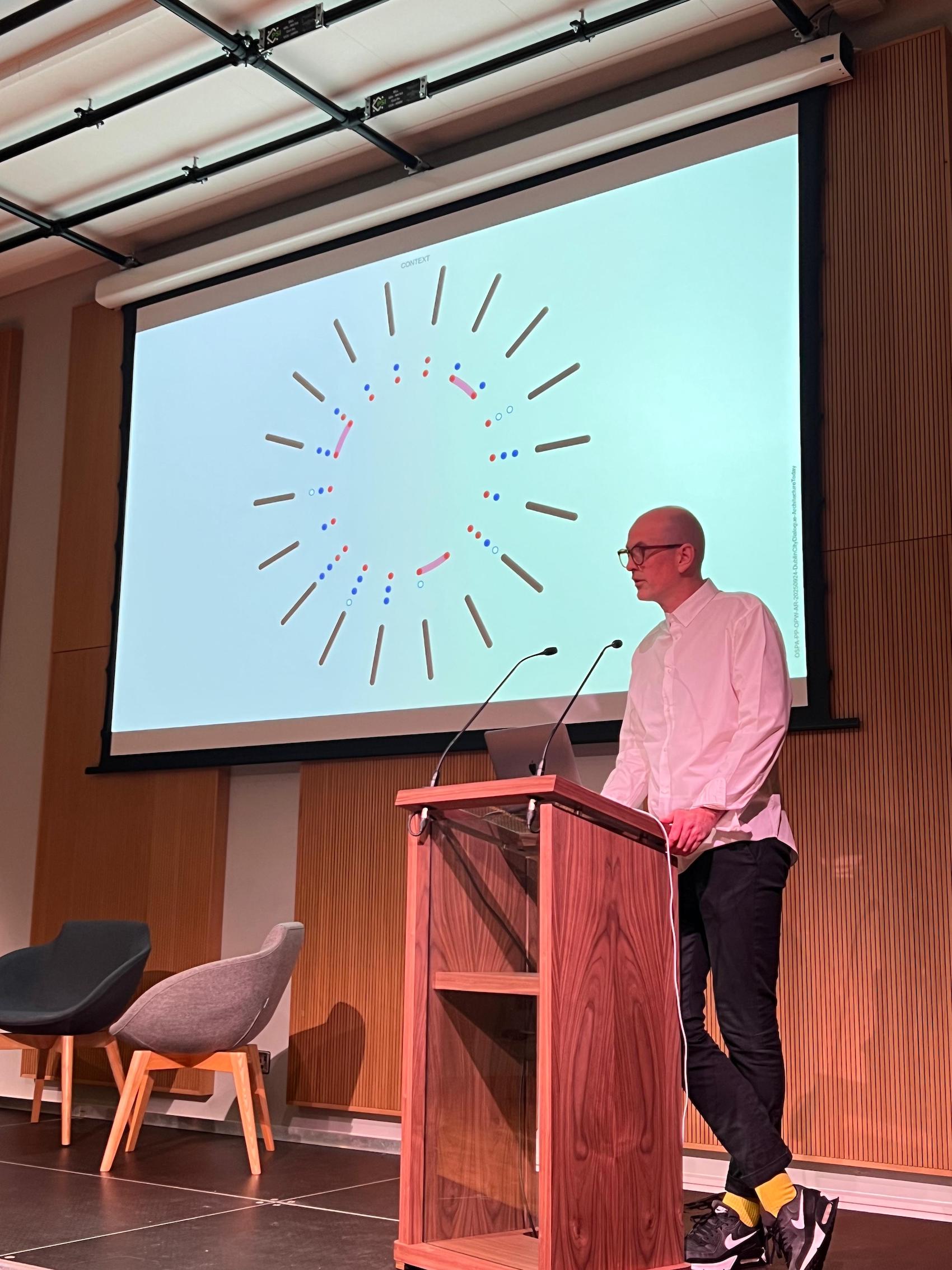 Stepping from hard infrastructure to the machinery of state, Conor Streenan, State Architect and Principal Architect, Office of Public Works (OPW), reframed the discussion around “creating conditions for change.” He set out how architecture sits within Ireland’s constitutional landscape, and why progress depends on making it “a matter of general public concern.” Anchoring his remarks in the 2022 National Policy on Architecture, he highlighted its four objectives – sustainability, quality, leadership and culture – and 45 actions, noting his remit to chair a delivery board. Rather than rush that step, he’s been testing practical levers: formal design-review engagement with Queen’s University Belfast; an internal OPW ‘radio’ to host cross-disciplinary conversations; international exchanges; and a public lecture series with the National Library. A procurement pilot is underway to shift incentives – an “always-on” Dynamic Purchasing System, a follow-on framework, and moves toward removing turnover and fee as selection filters – to help “reposition the value of the discipline within government priorities.”