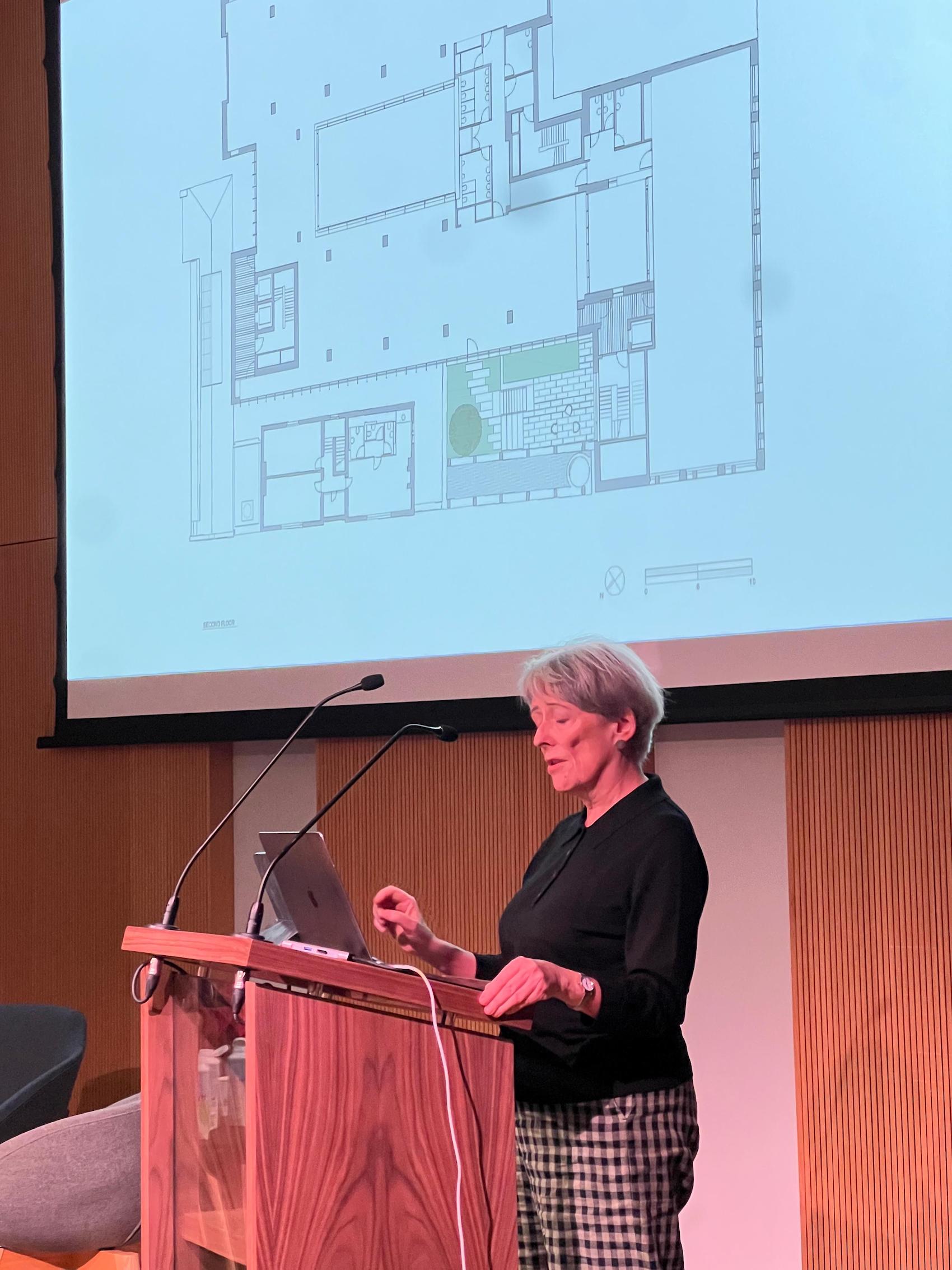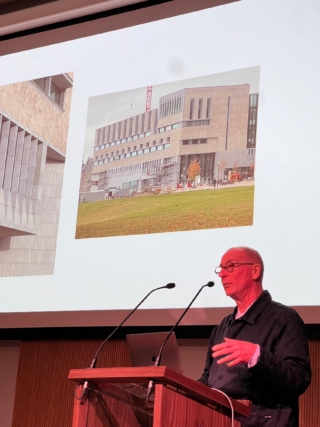 Following a short coffee break, John Tuomey, Founding Director of O’Donnell + Tuomey Architects, presented two civic projects currently under construction: the Academic Hub at TU Dublin’s Grangegorman campus, and the Culture House for Fingal County Council in Swords. Both are, in his words, “libraries in all but name.” At Grangegorman, the academic hub sits at the centre of a masterplan that transforms a former walled asylum into an open campus. Conceived as the ‘town hall’ of the university, it will bring together social and study spaces around the refurbished North House, with new limestone-clad wings framing courts and gardens. Tuomey emphasised how the design works within the masterplan’s tight ‘red-line’ footprint, carving solidity and permanence into forms that respect the Victorian building, while opening long windows south to the Dublin Mountains. The building has been designed to grow in increments, with unfinished edges deliberately left ready for future expansion.