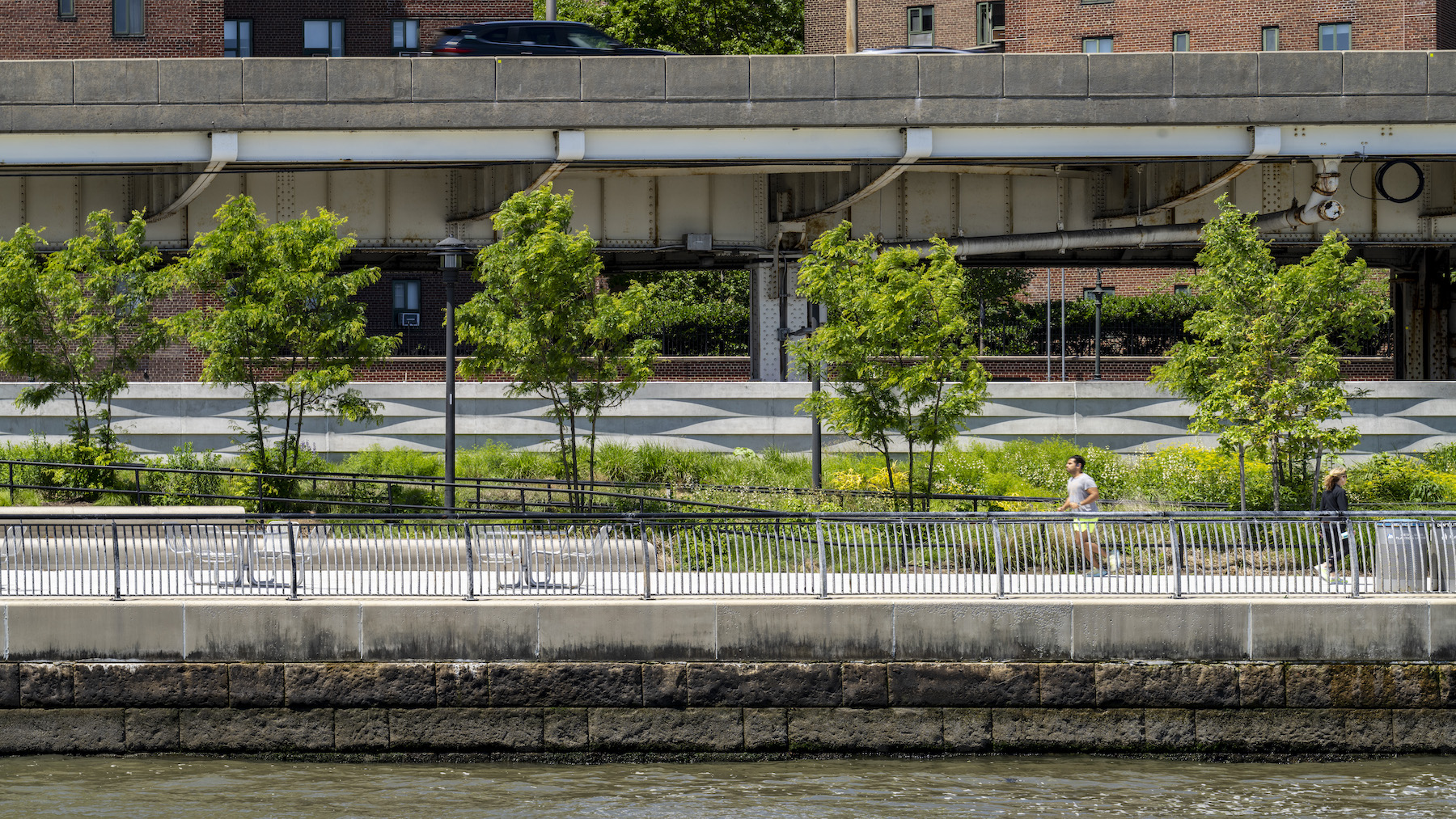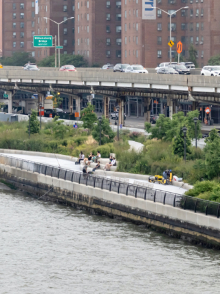 Above: The East River Park runs alongside FRD Drive, with a floating bike lane to the west of the sea wall.