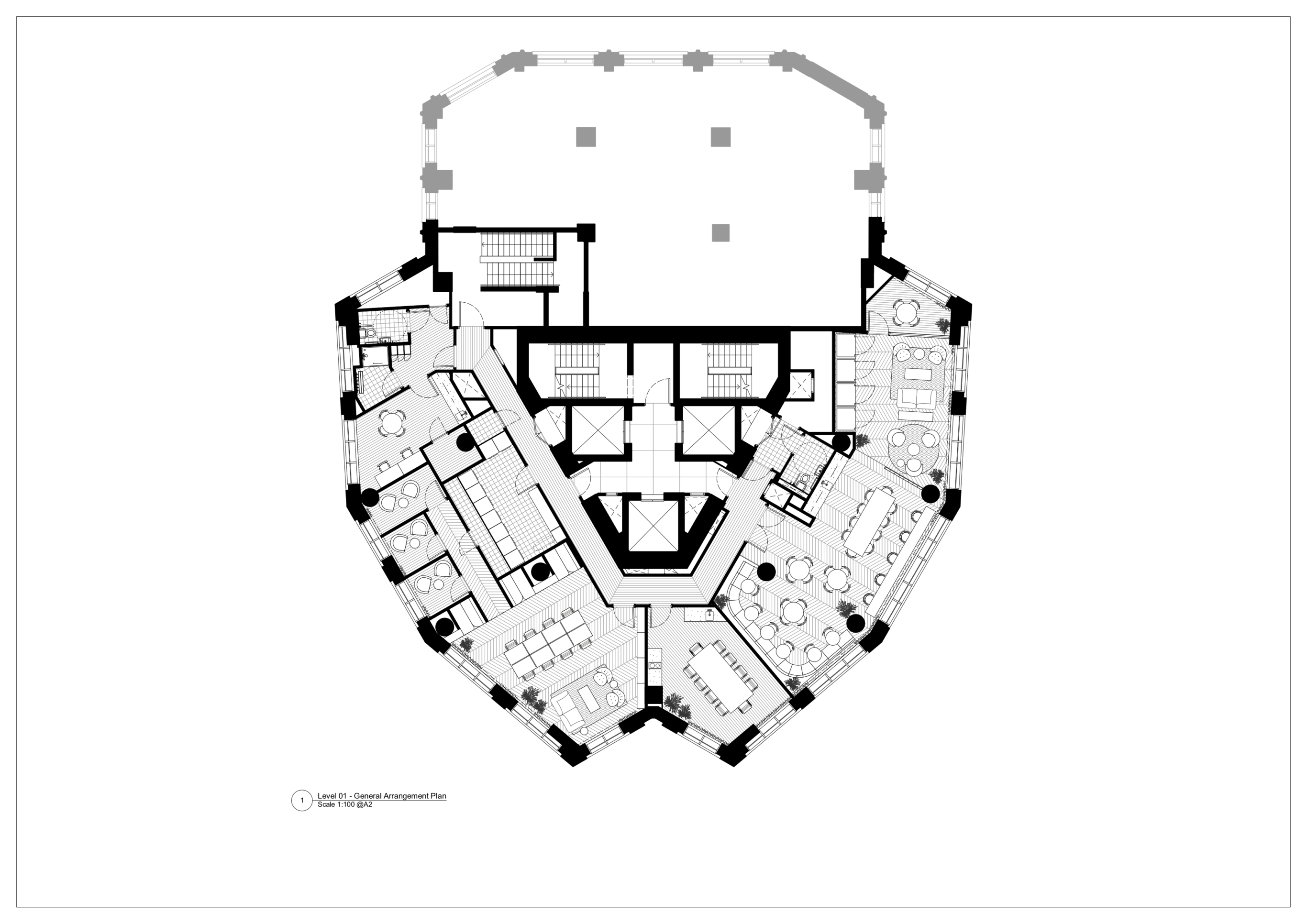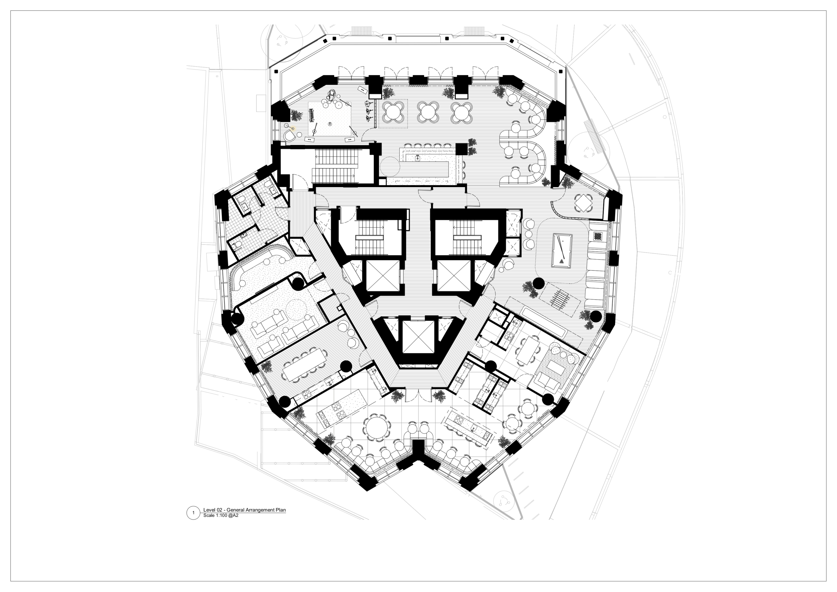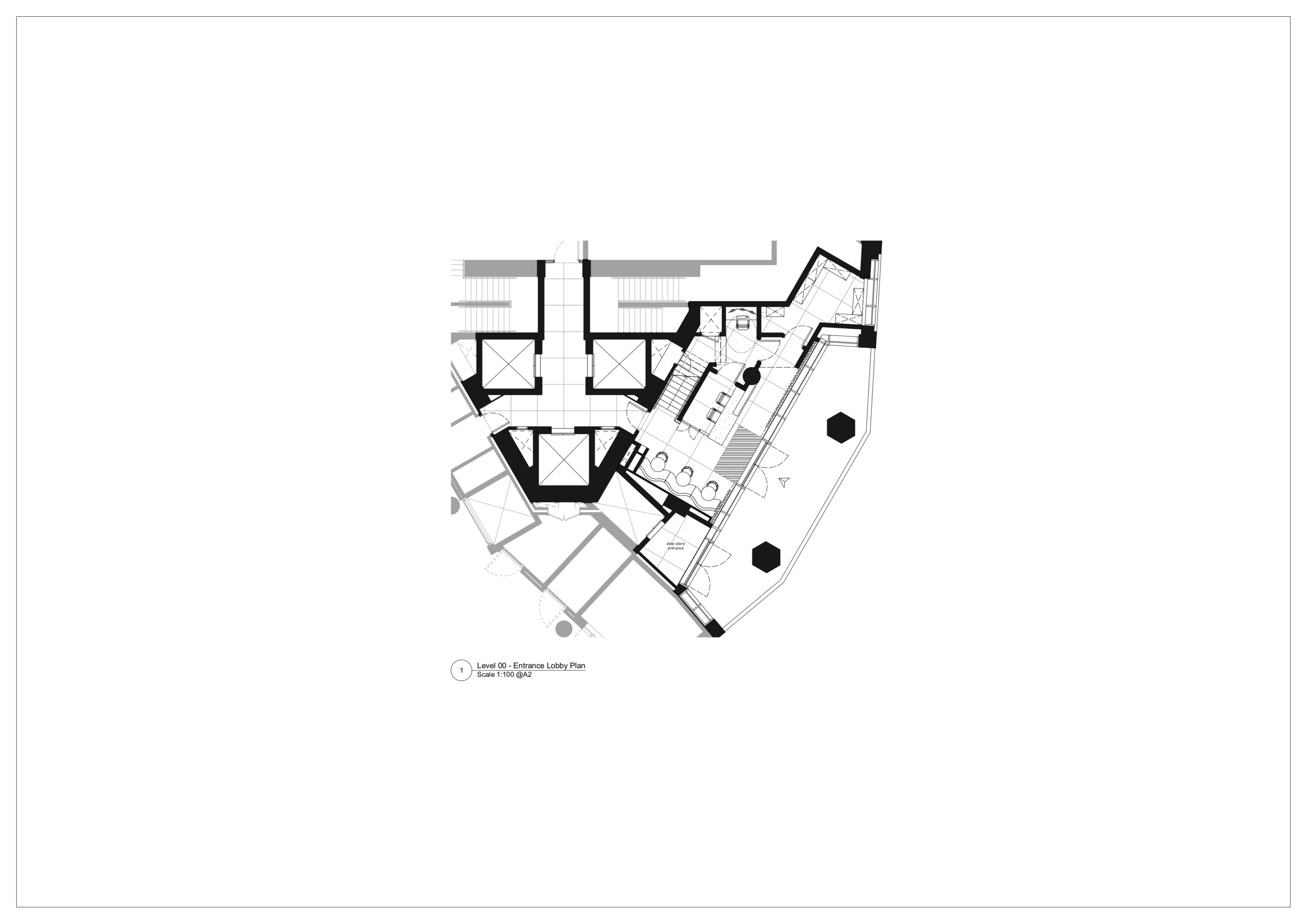 The building is organised as two interlocking volumes of 27 and 32 storeys, shaped by the site’s unusual diamond geometry. This triangulated plan produces a slender profile while allowing the internal layout to remain highly efficient. Above the pub, 462 studio apartments are stacked within a modular framework, each averaging 22.5 square metres and designed to balance compact private living with shared amenities and communal space, which is a key tenet of the project’s co-living model.
