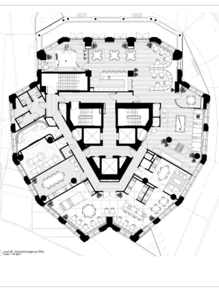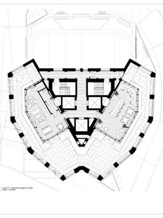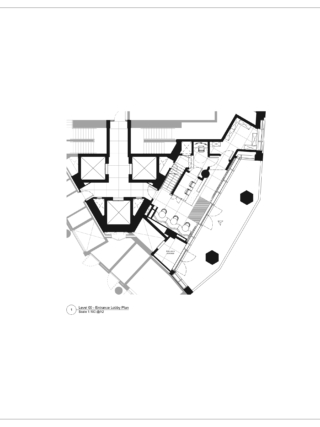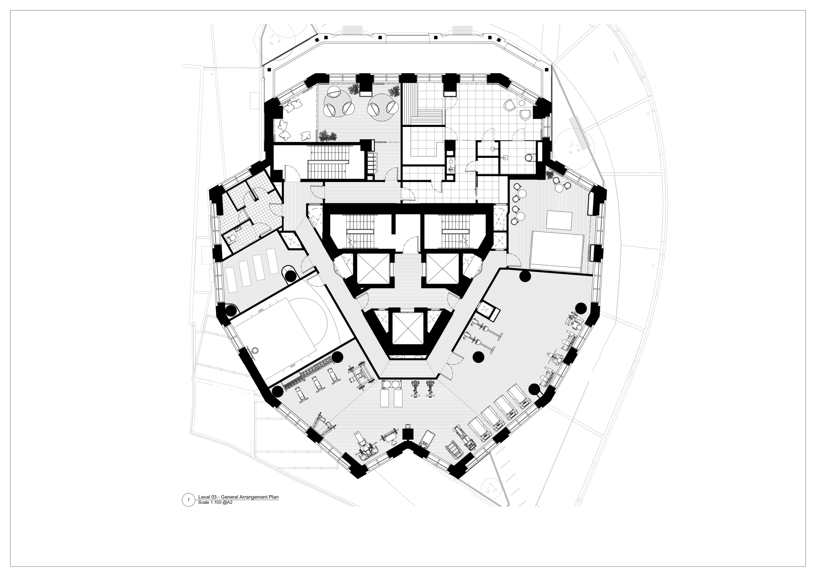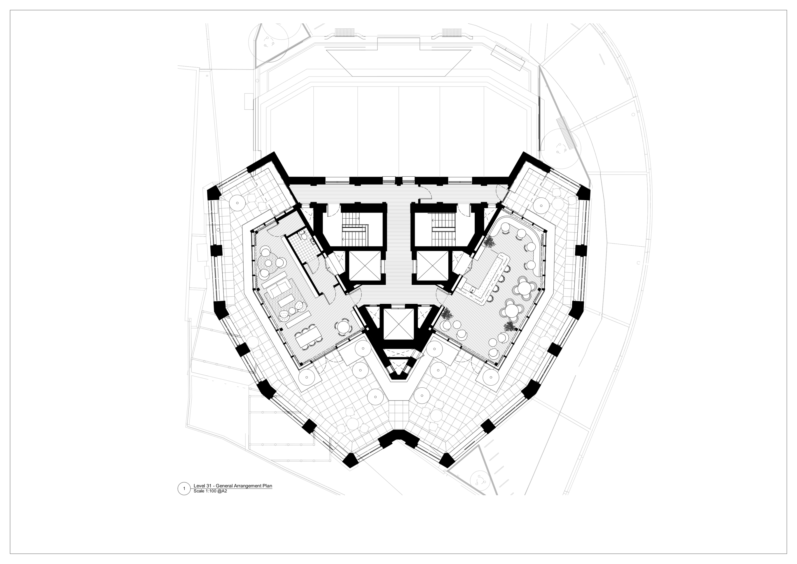 The building is organised as two interlocking volumes of 27 and 32 storeys, shaped by the site’s unusual diamond geometry. This triangulated plan produces a slender profile while allowing the internal layout to remain highly efficient. Above the pub, 462 studio apartments are stacked within a modular framework, each averaging 22.5 square metres and designed to balance compact private living with shared amenities and communal space, which is a key tenet of the project’s co-living model.