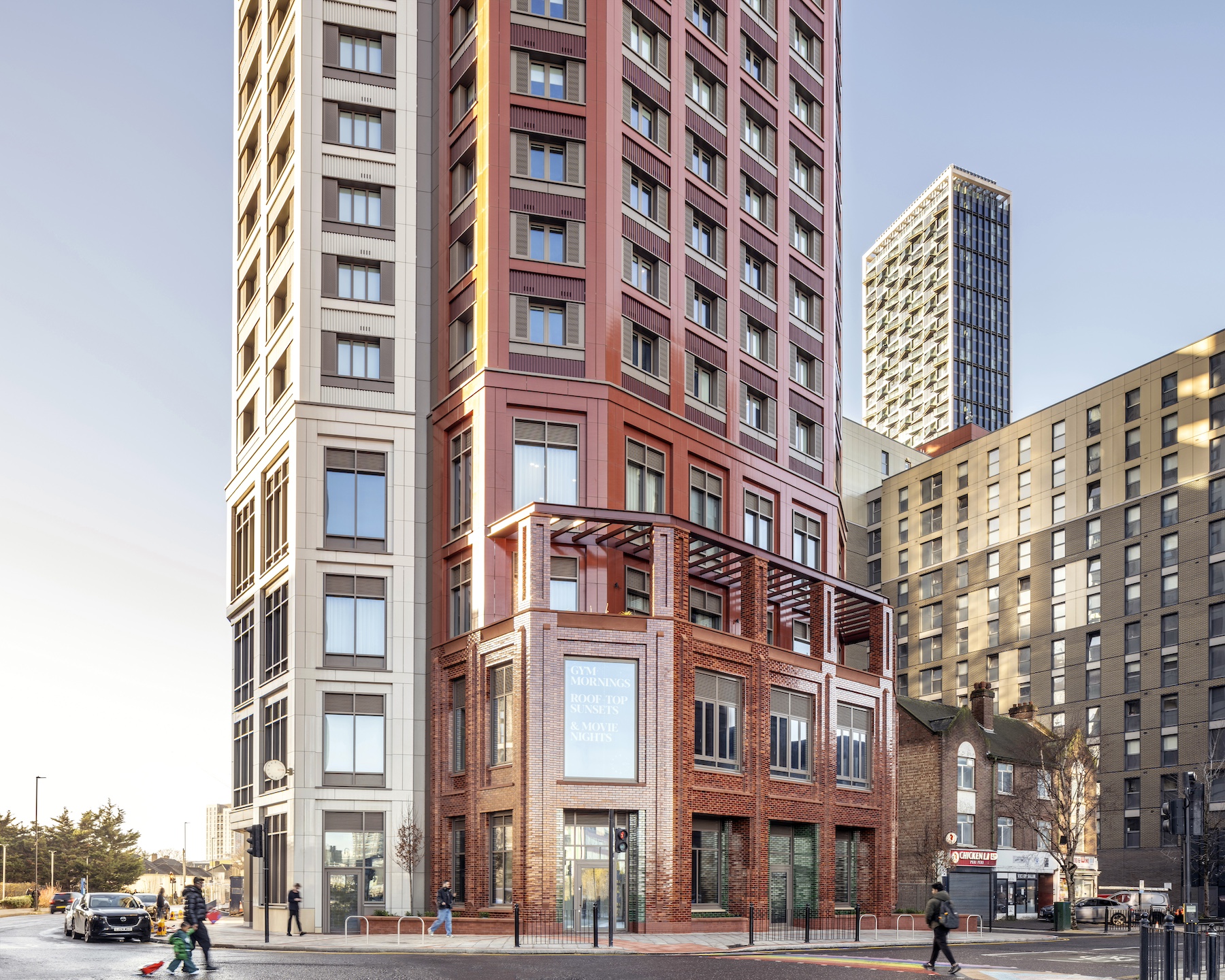 Rising to 106 metres, the building forms part of the wider regeneration of the Old Oak and Park Royal Opportunity Area and sits three minutes’ walk from North Acton station. Despite its scale, the project is closely anchored to its immediate context: the Castle Pub is reinstated at ground level, with a public function room above, ensuring that the site’s long-standing social role continues to animate the street.