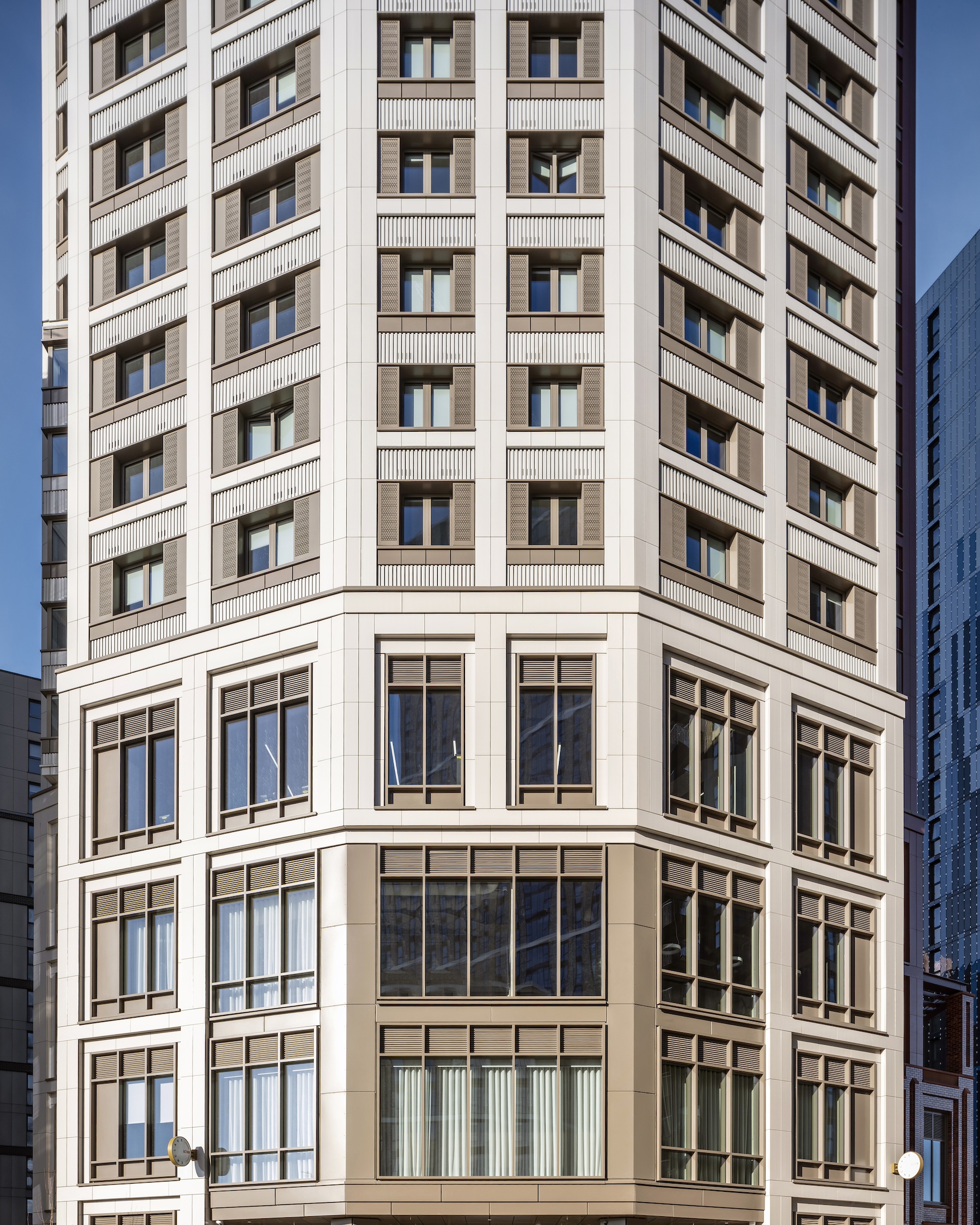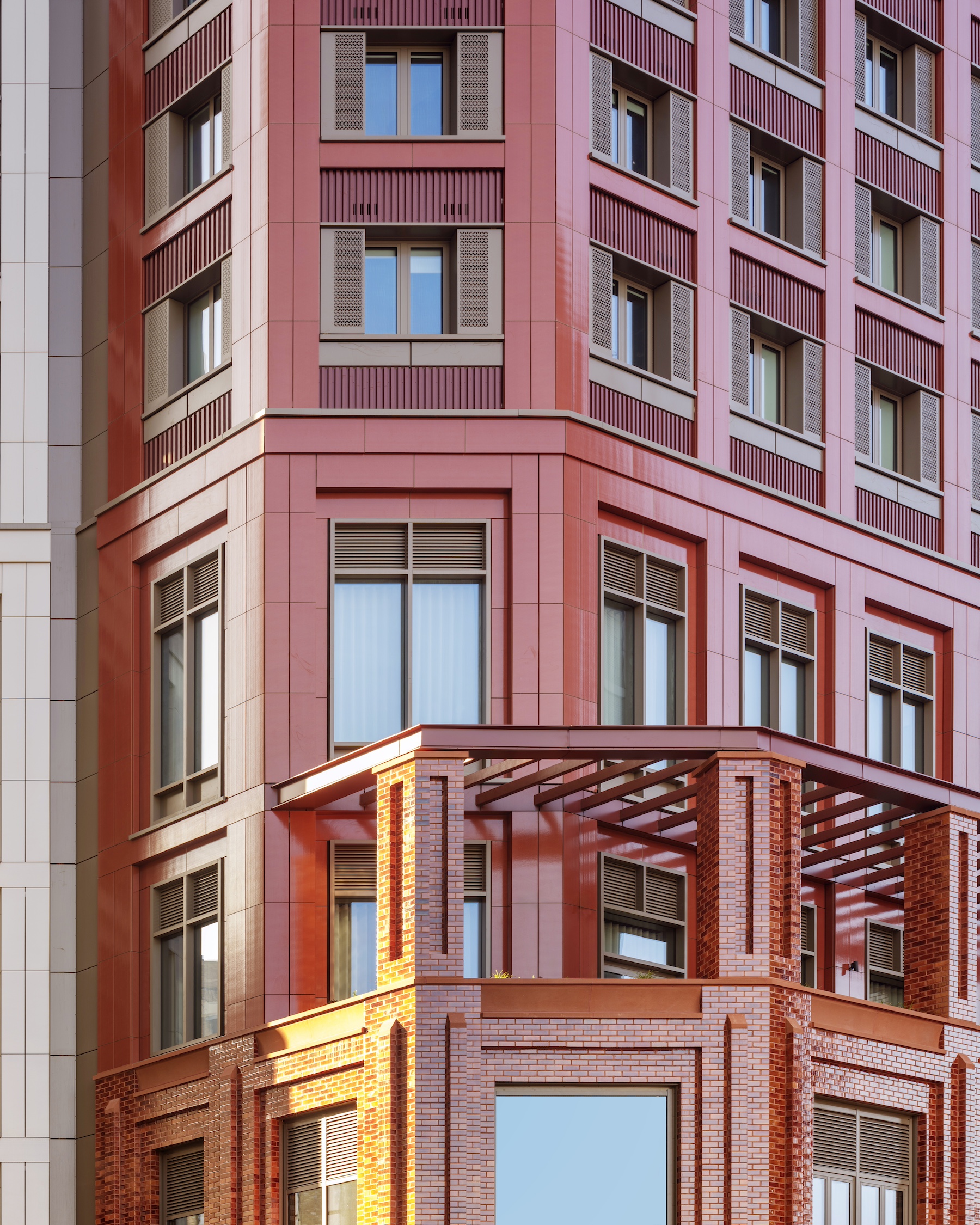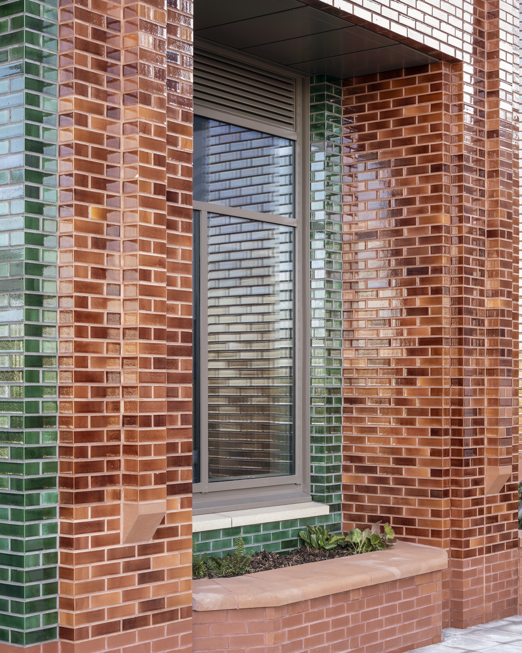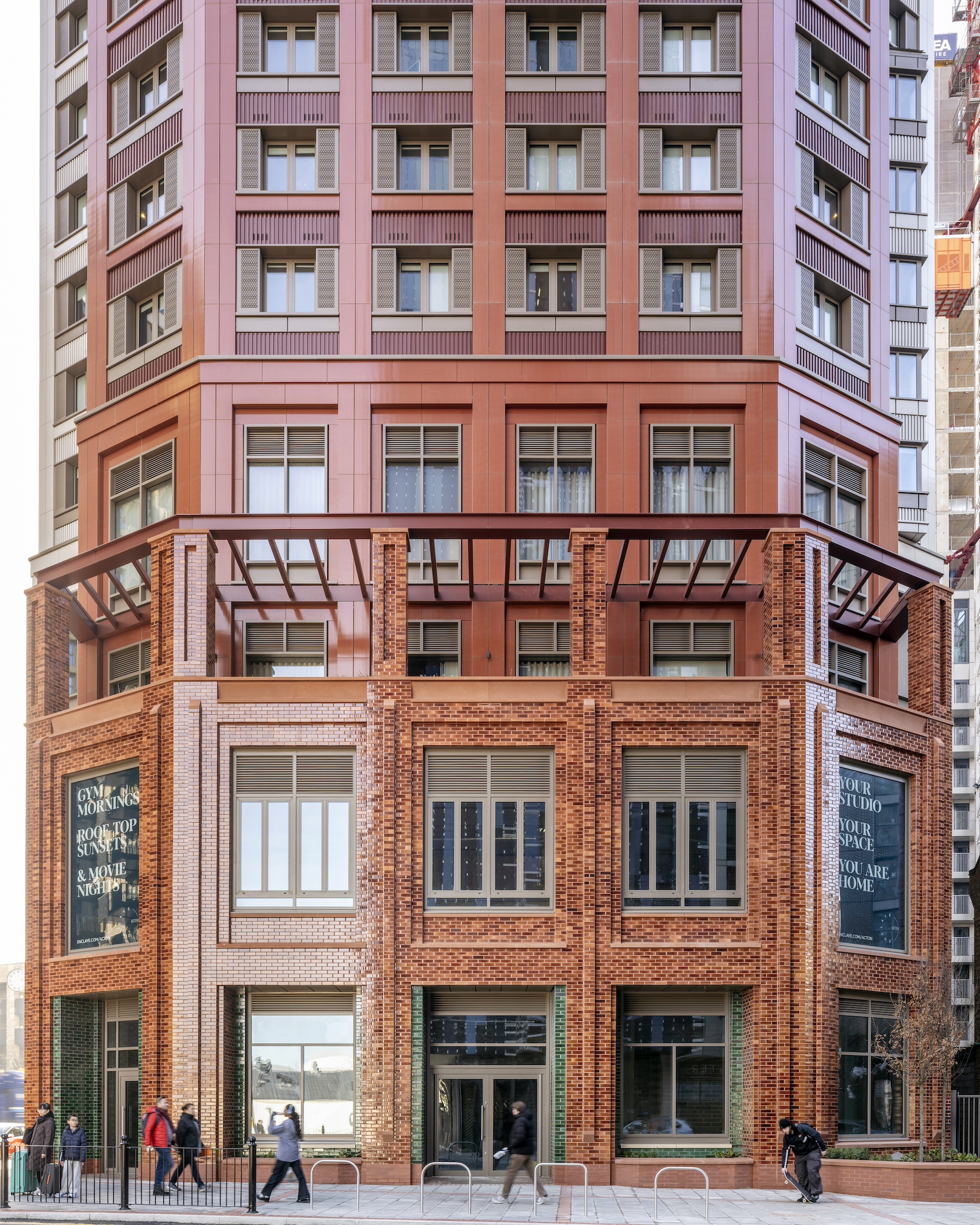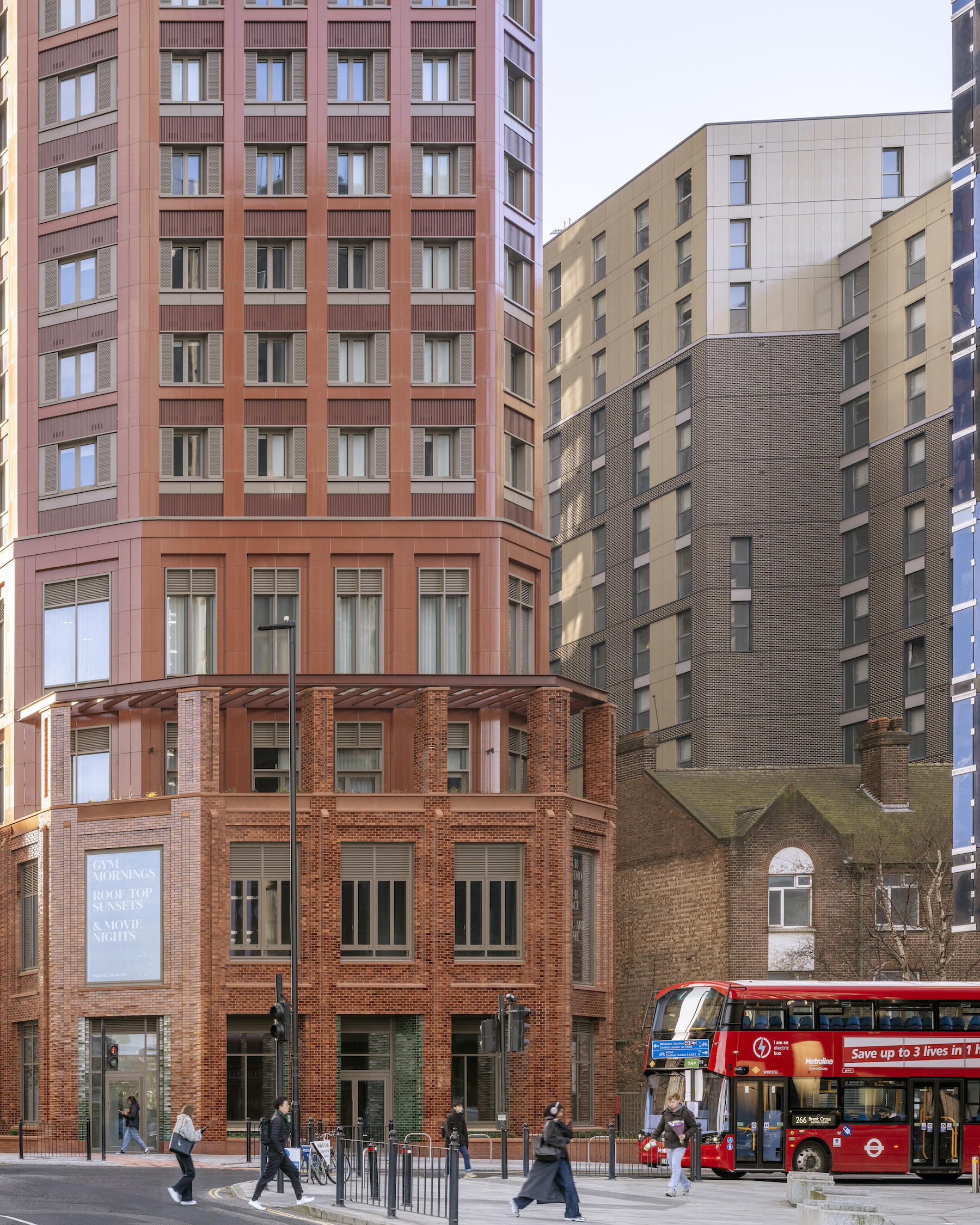 Externally, the façade combines warm glazed terracotta tiles with aluminium infill panels and polished glass-reinforced concrete. Glazed bricks are arranged in faceted patterns with deep reveals that catch and reflect daylight, giving the tower a sense of texture and depth as it rises. This detailing is consistent across the building’s varied uses, helping to unify the pub, communal floors and residential levels into a single architectural expression.