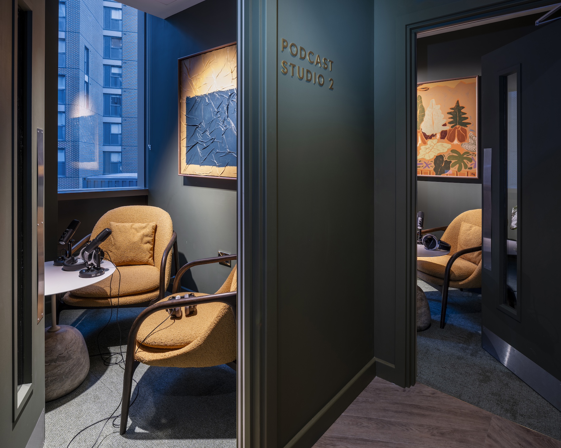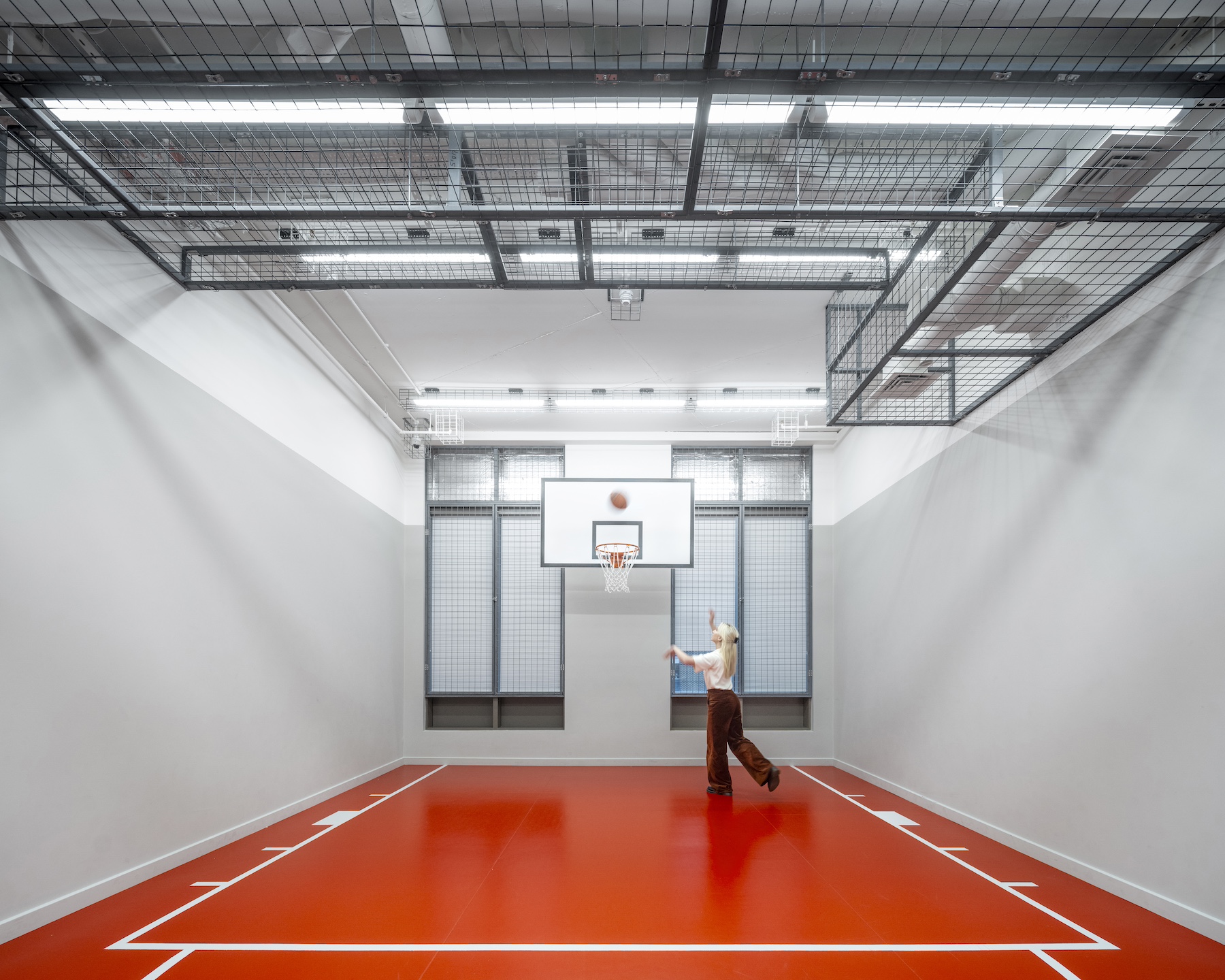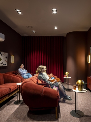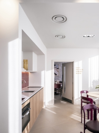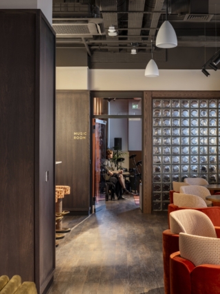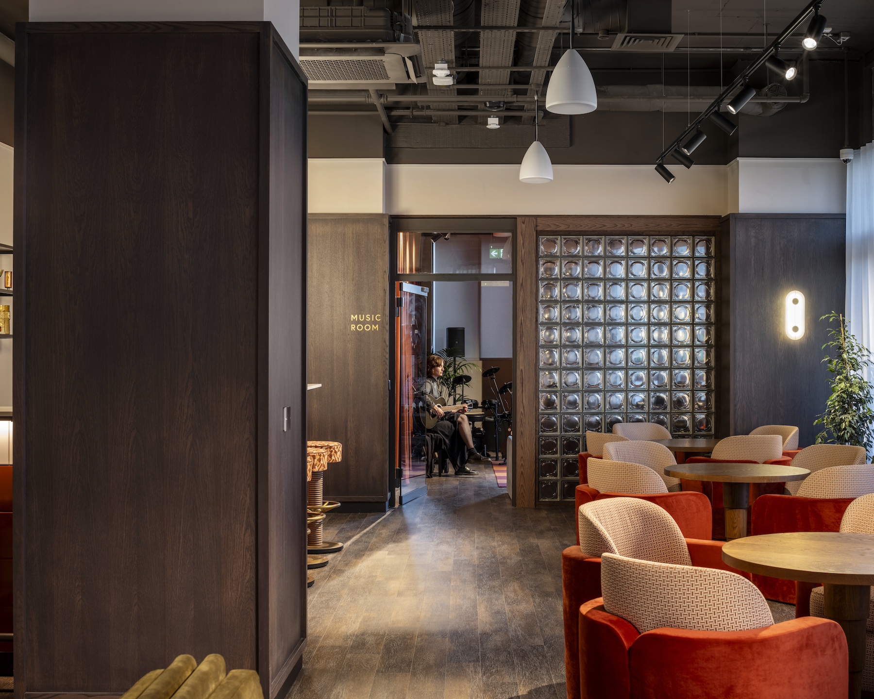 HTA also led the interior design, drawing on the character of the former Castle Pub and the nearby BBC Television Rehearsal Rooms. Arts and Crafts references are abstracted through basket-weave patterns and carefully detailed joinery, set against a palette of bold, mid-century colours.
