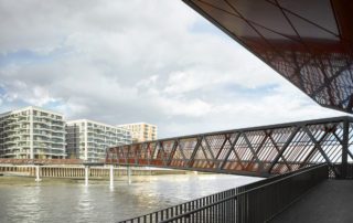 Won in competition, Nex’s Royal Wharf Pier is major a new riverboat terminal located on the River Thames at London’s Royal Docks. Replacing an existing derelict jetty, the 130-metre long structure is adjacent to Ballymore and Oxley’s Royal Wharf development and includes a large public space. The steel and timber pier comprises six individual sections, which were manufactured in the Netherlands using shipbuilding techniques. Delivered to London by barge, each piece was floated down the River Thames to its final position, having travelled more than 300 miles in the process.