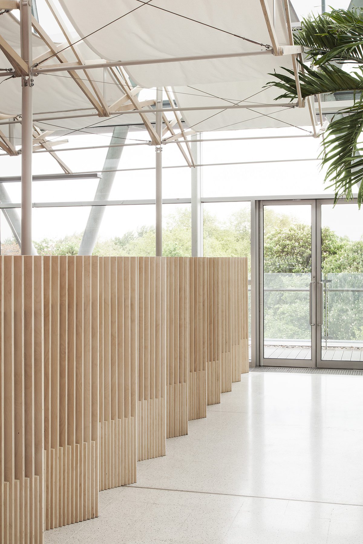A lightweight canopy designed by London-based architect CarverHaggard provides a shady space for medical staff to work within the soaring glass atrium of Hopkins Architects’ Evelina Children’s Hospital.