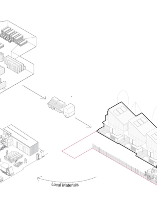 Externally, the terrace reads as a compact, contemporary row of modest dwellings, unified by simple massing and generous fenestration. Large windows and carefully orientated openings ensure good daylight levels throughout, reducing reliance on artificial lighting, while inside, each unit features an open-plan kitchen and living area at ground level, with a bedroom and storage space above.