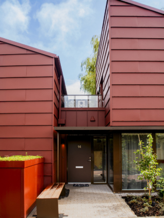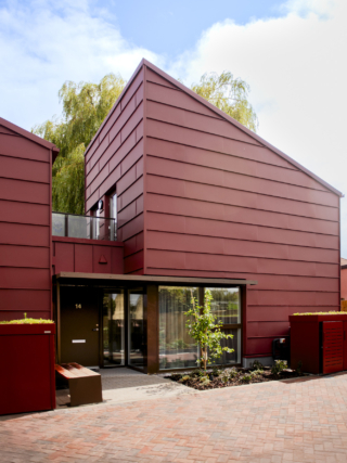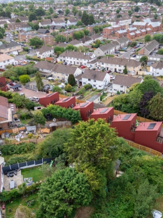 Each two-storey home is constructed using modern methods of construction (MMC), with prefabricated structural insulated panels manufactured off-site by Etopia, allowed the project to overcome the logistical challenges of a confined plot with limited access.