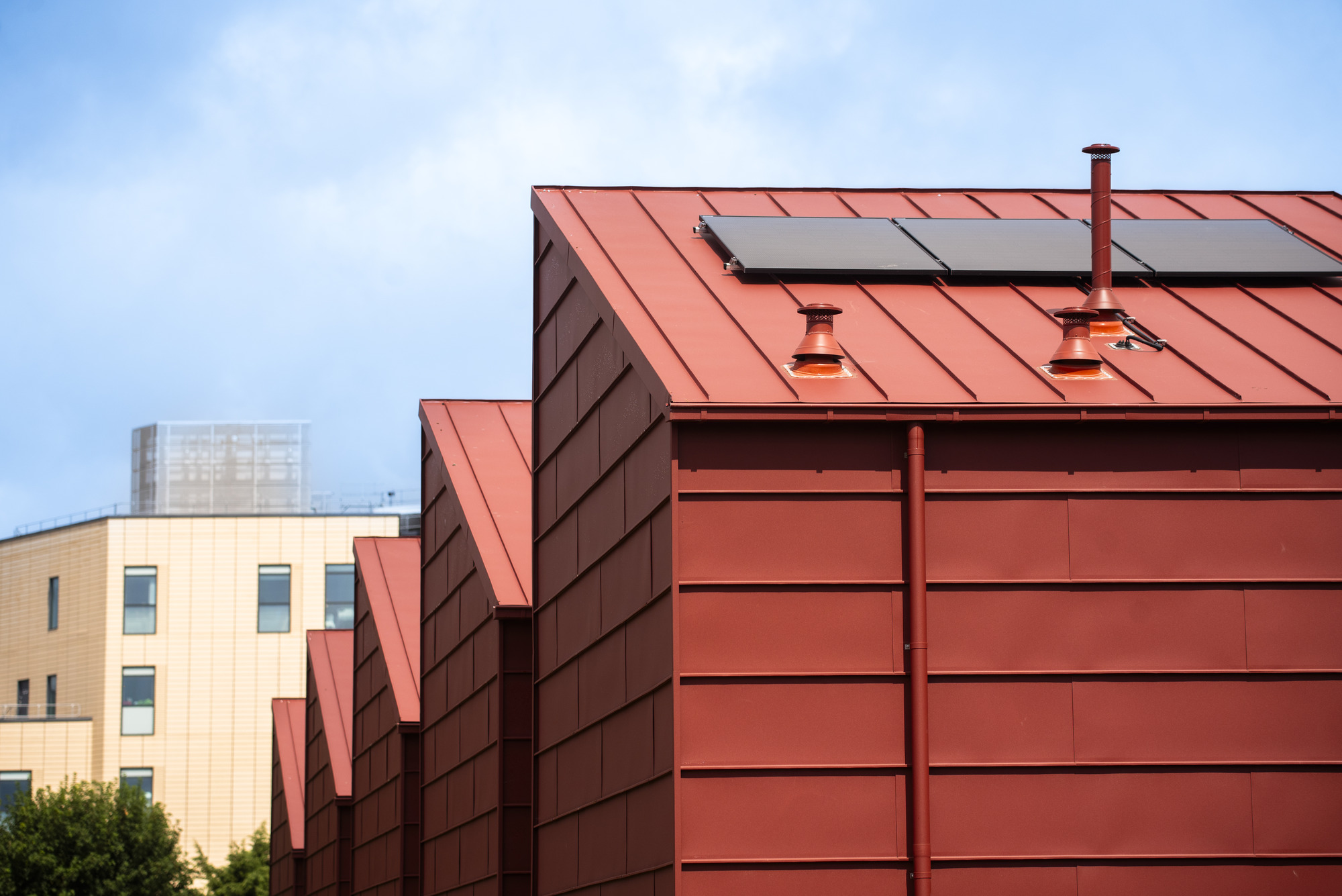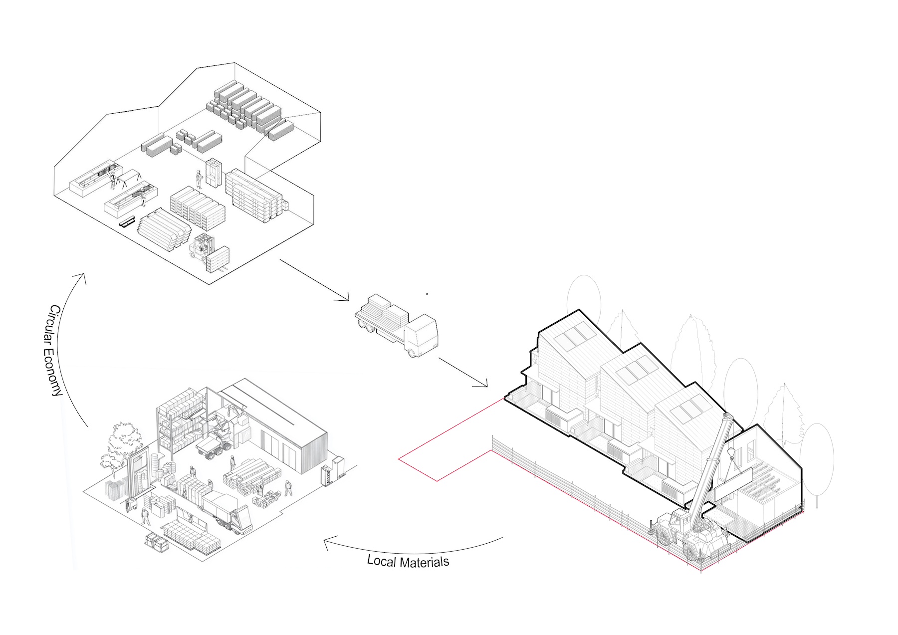 Each two-storey home is constructed using modern methods of construction (MMC), with prefabricated structural insulated panels manufactured off-site by Etopia, allowed the project to overcome the logistical challenges of a confined plot with limited access.