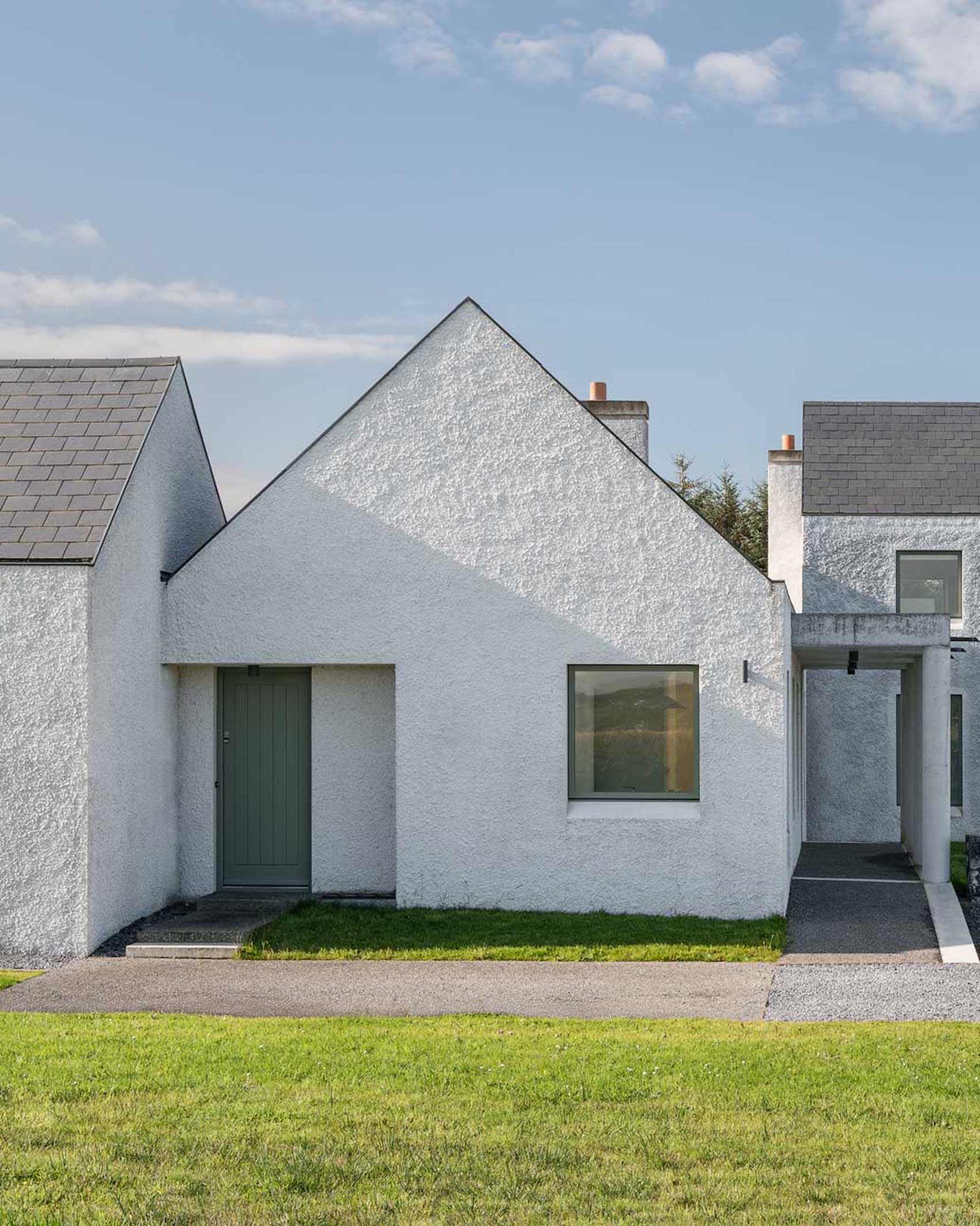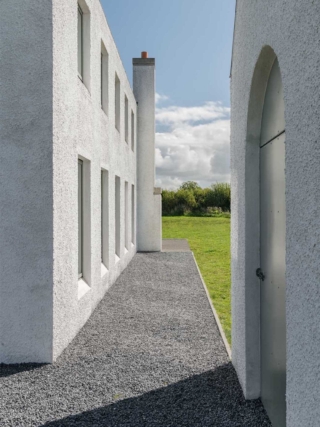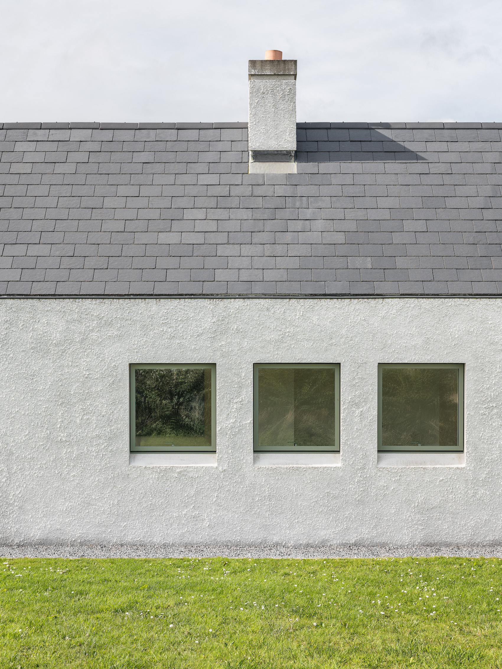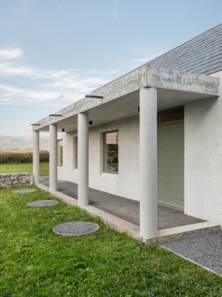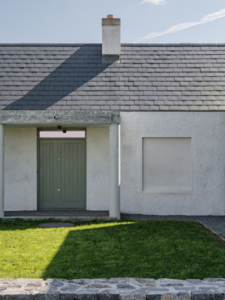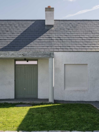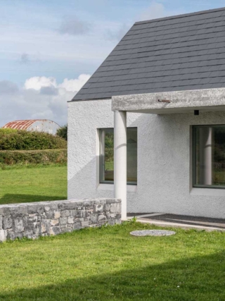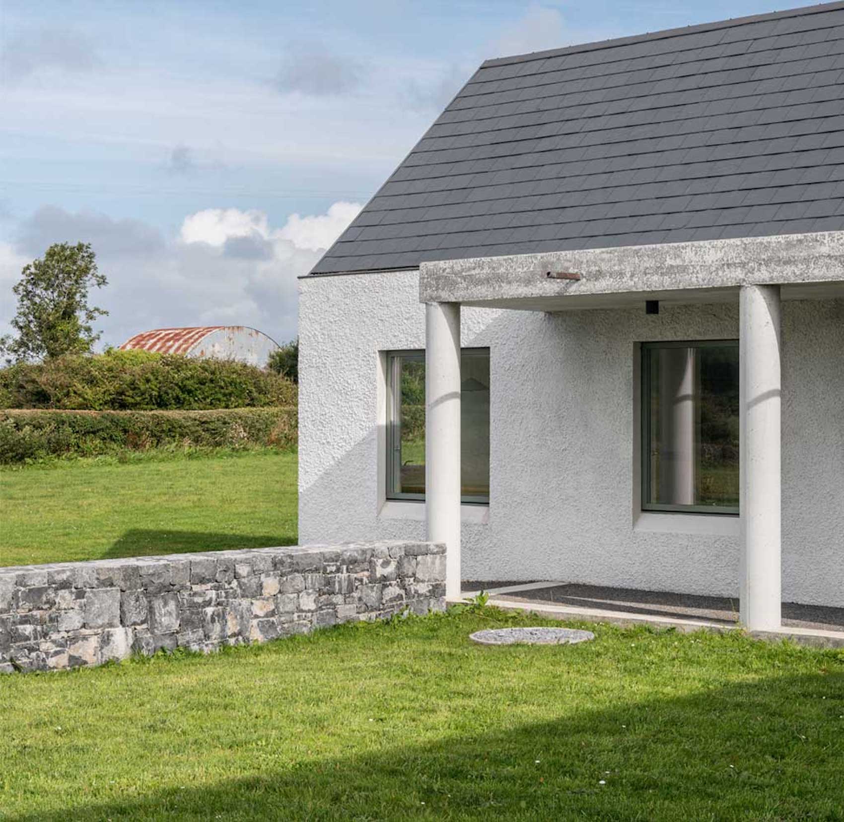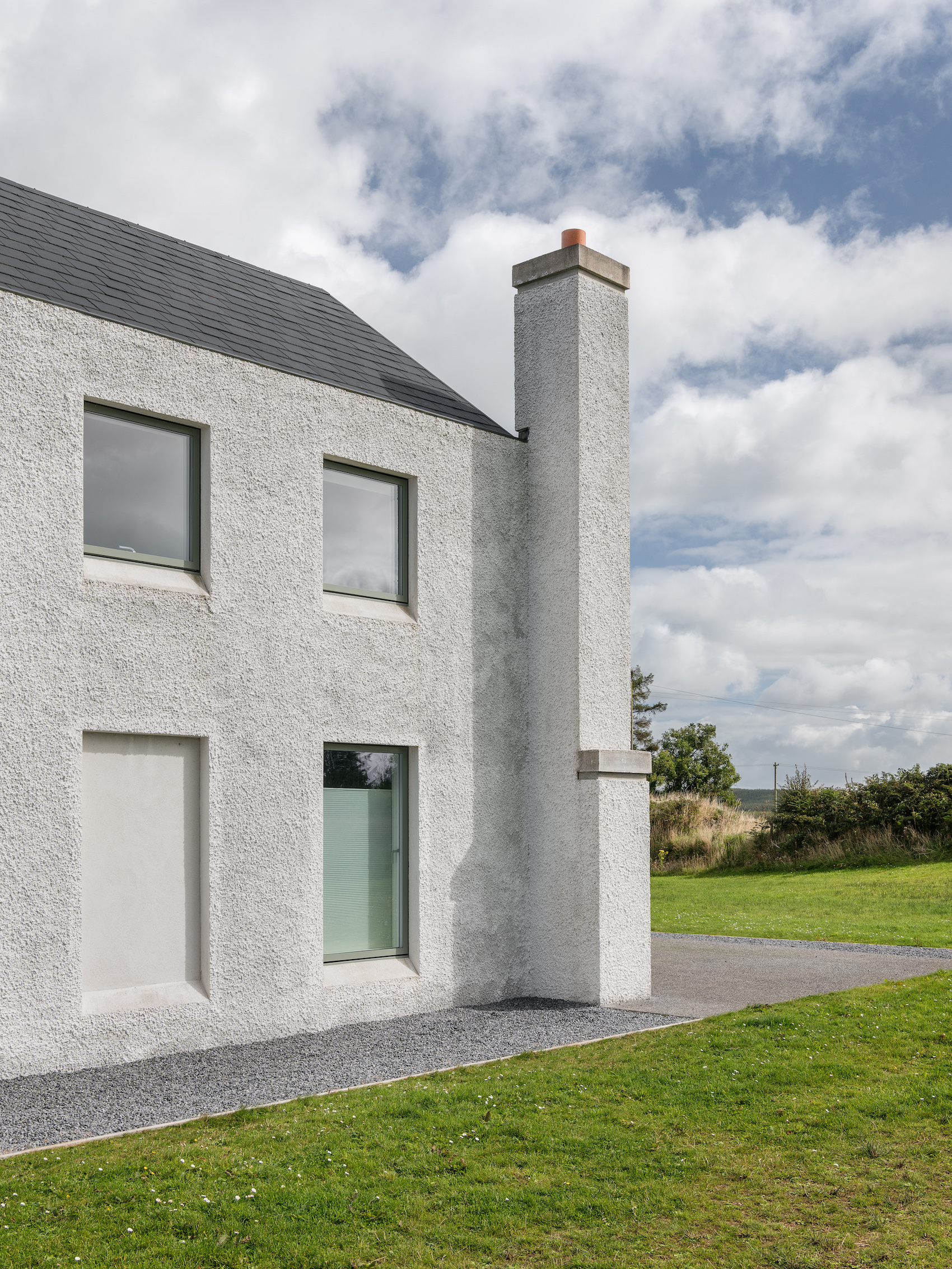 Materially, the house has a wet dash plaster finish, drystone walling and a black slate roof, aligning itself with local building traditions. These choices are pragmatic, using established methods and materials to mediate between climate, craft and context.