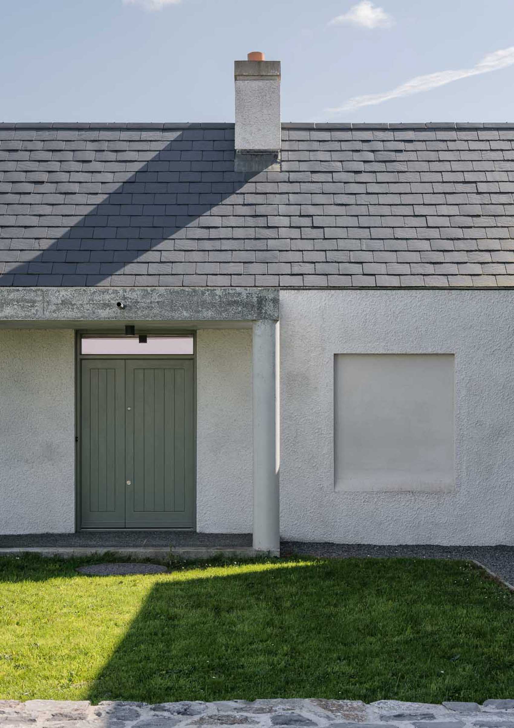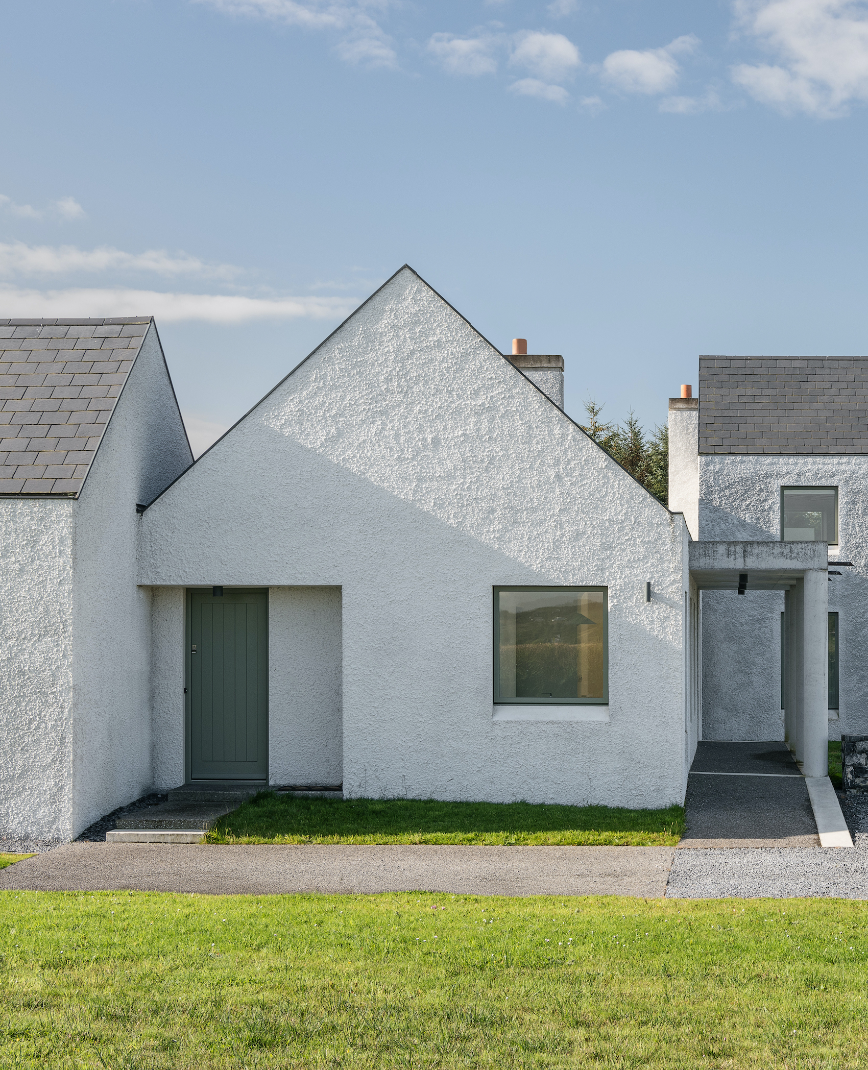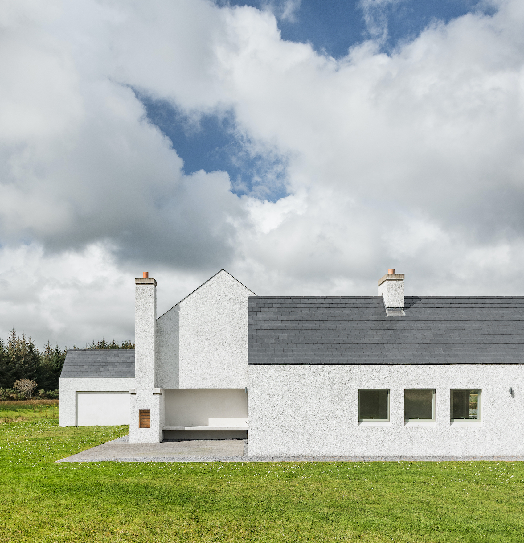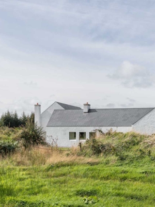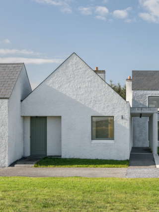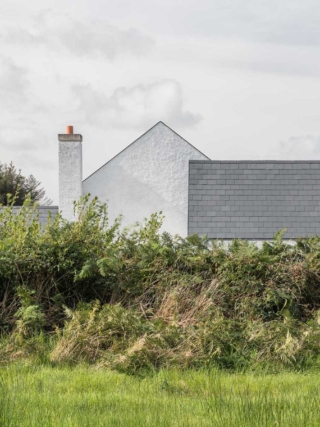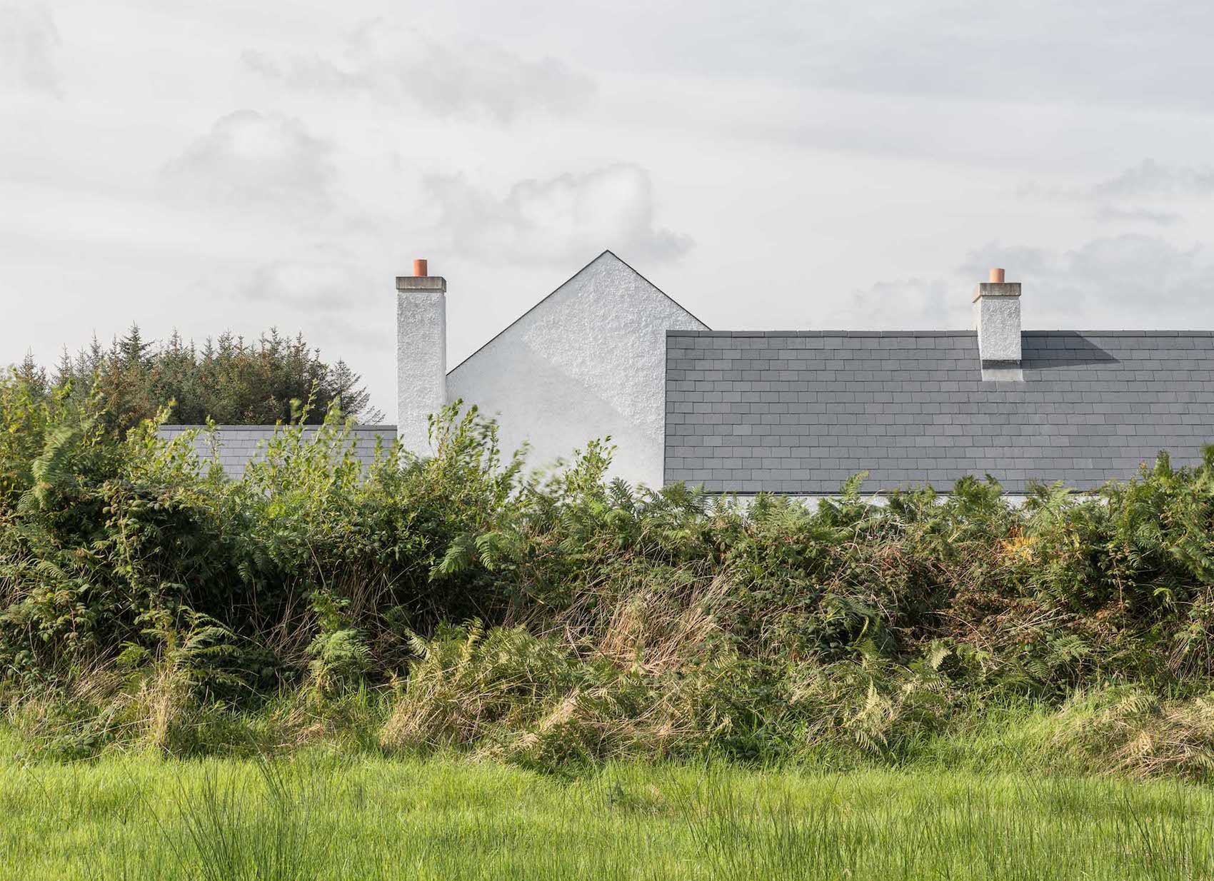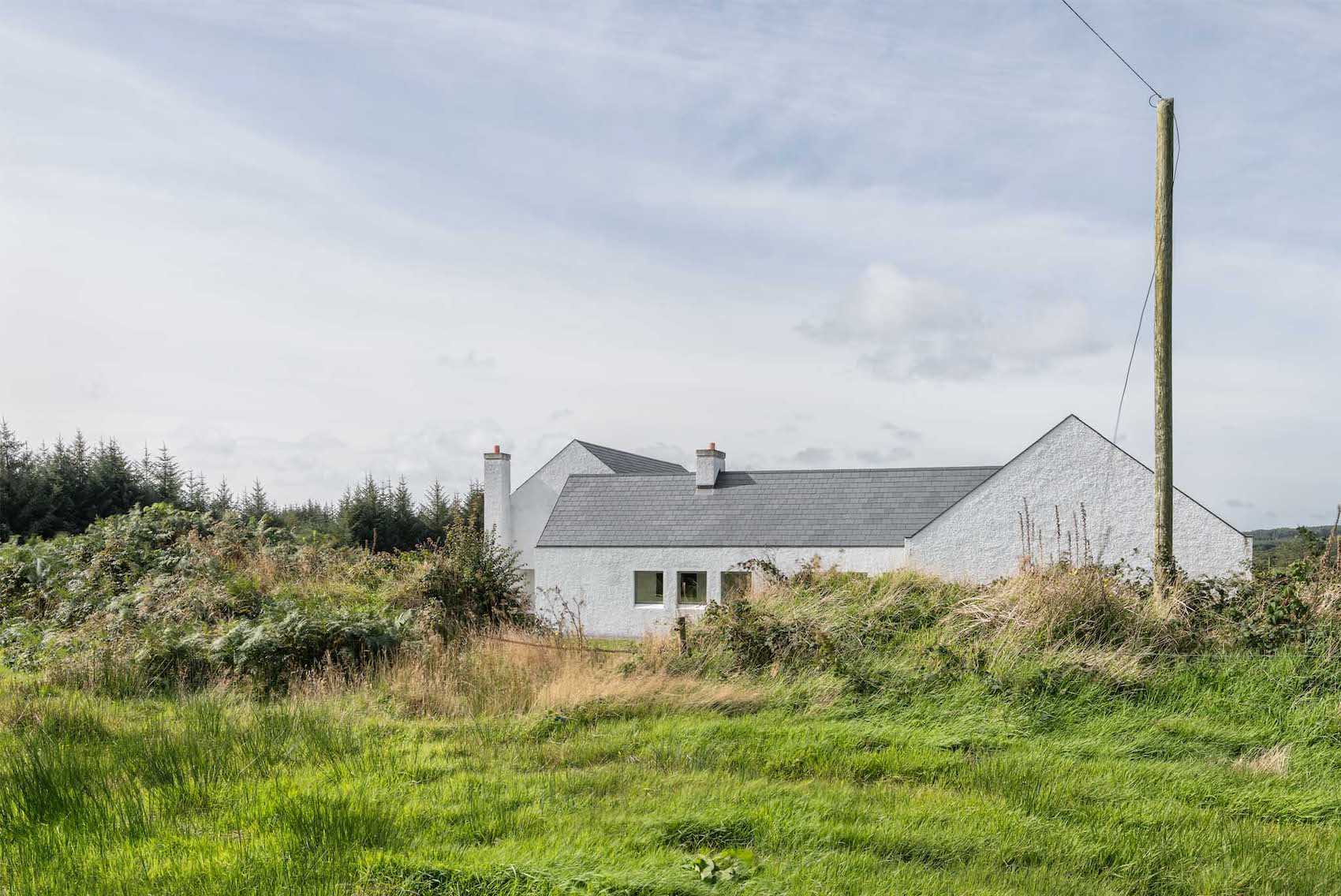 Materially, the house has a wet dash plaster finish, drystone walling and a black slate roof, aligning itself with local building traditions. These choices are pragmatic, using established methods and materials to mediate between climate, craft and context.