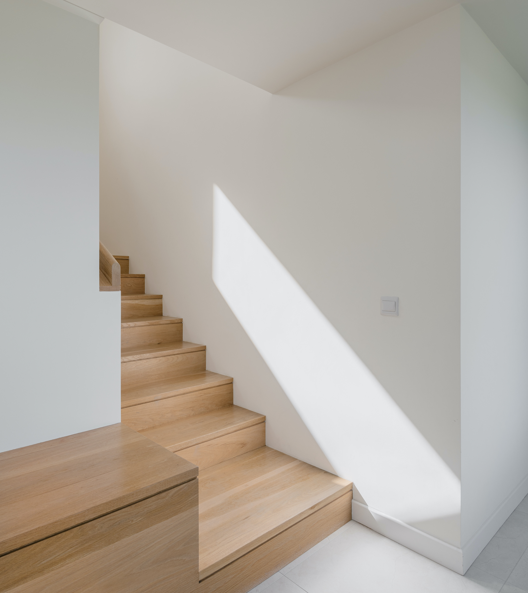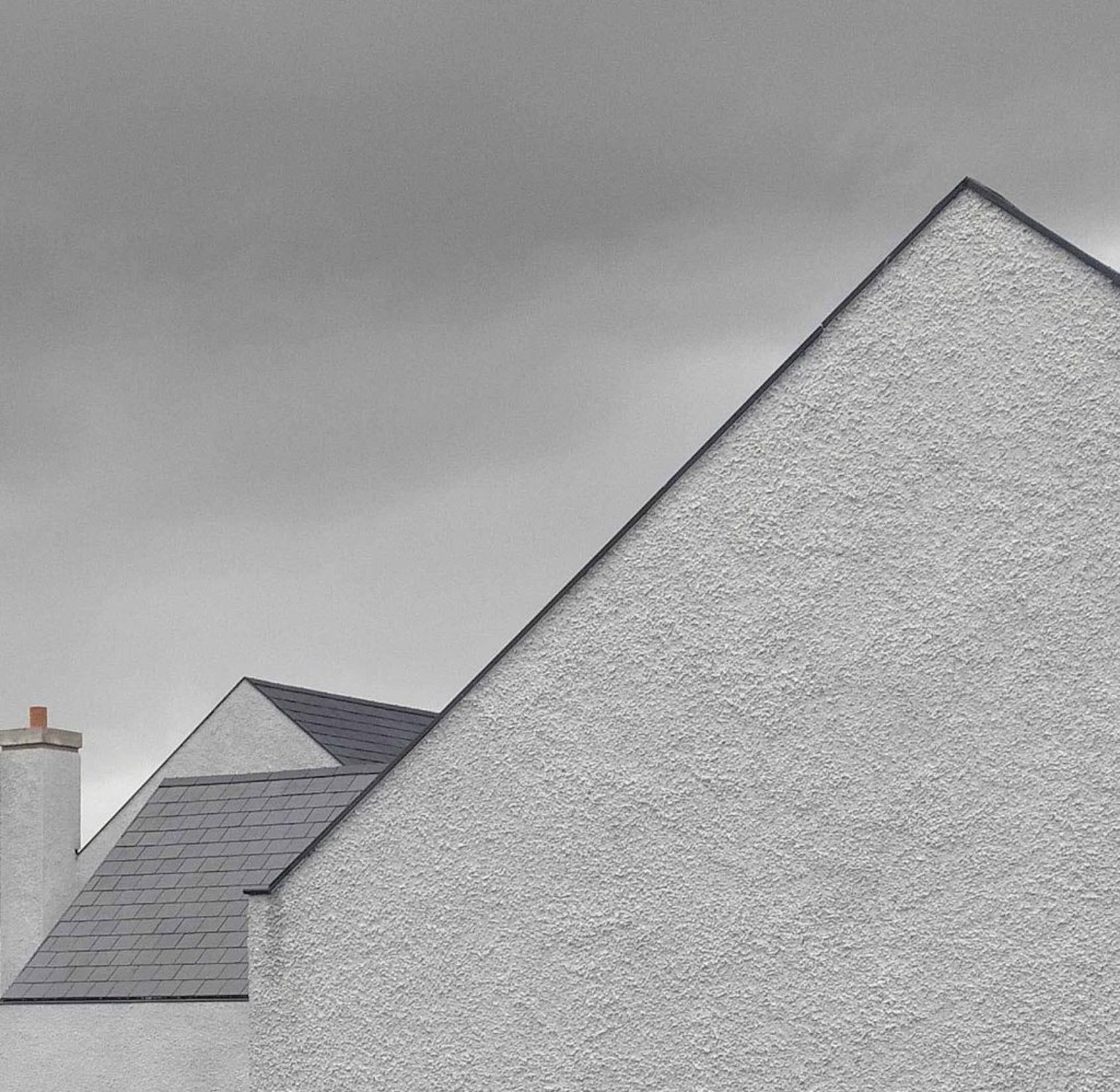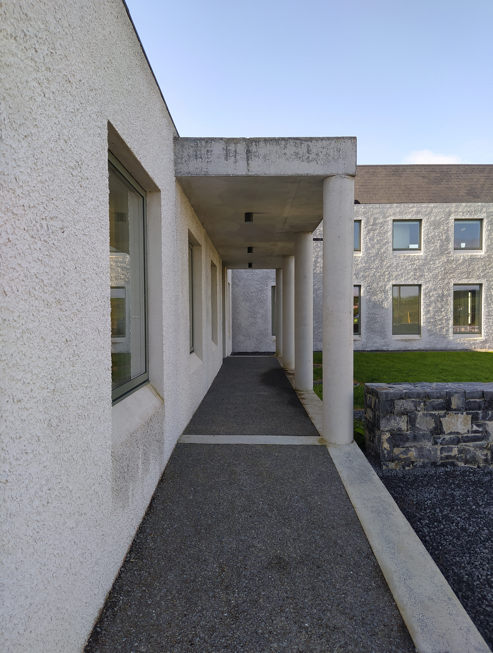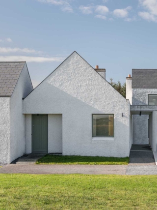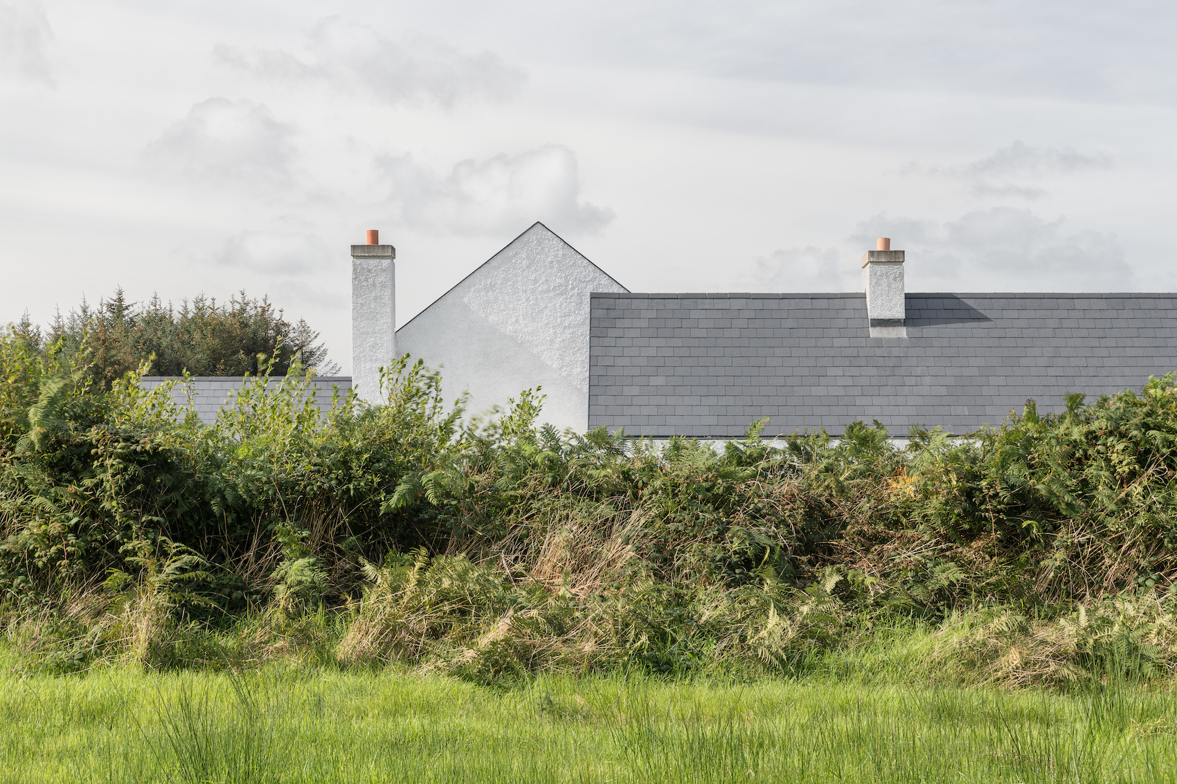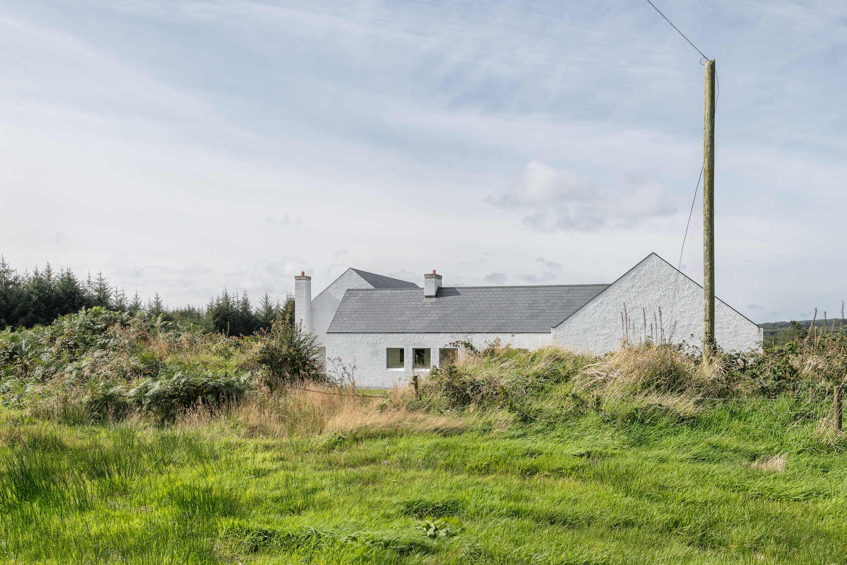 Materially, the house has a wet dash plaster finish, drystone walling and a black slate roof, aligning itself with local building traditions. These choices are pragmatic, using established methods and materials to mediate between climate, craft and context.