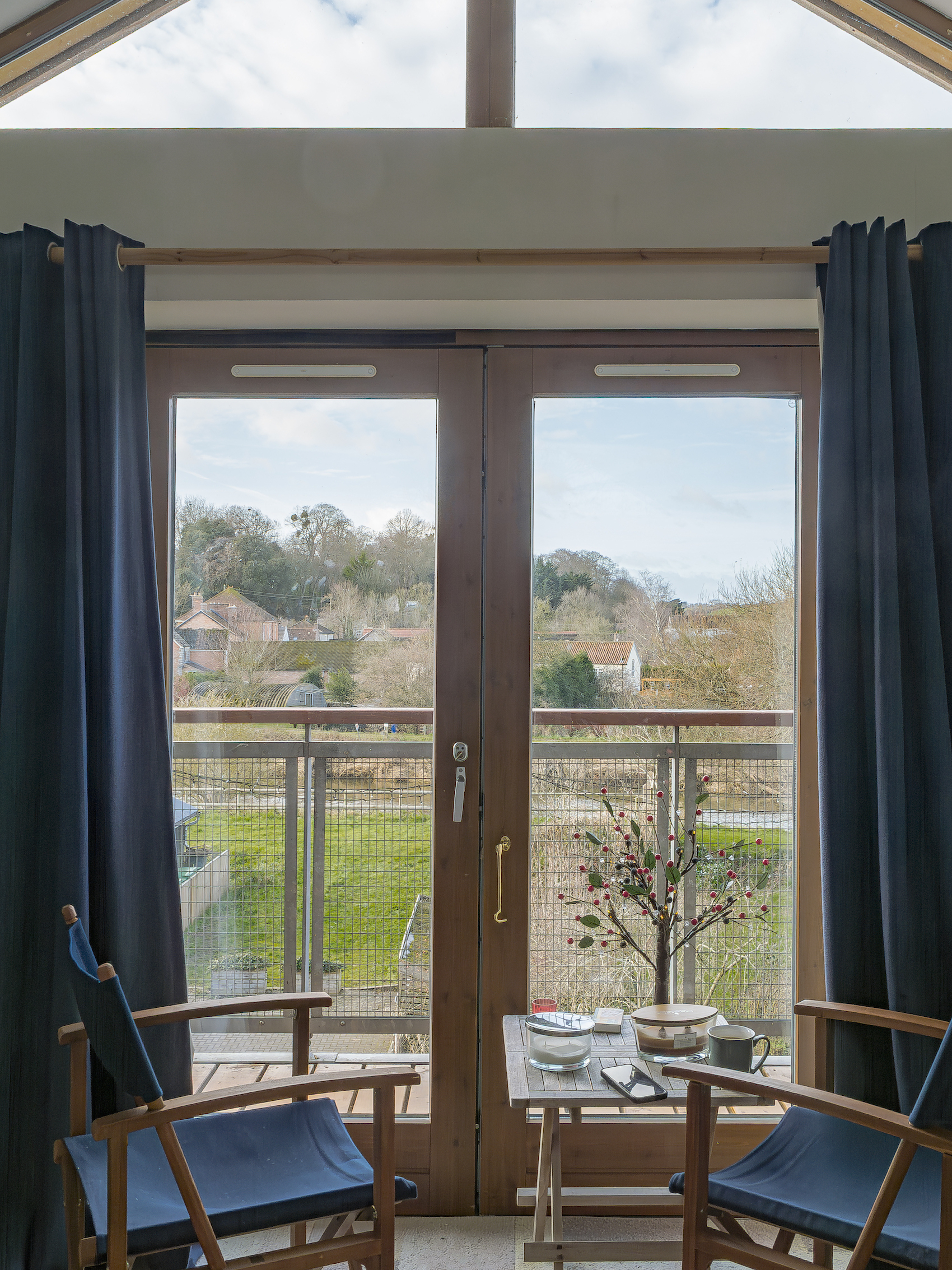 Rob Delius The development borders the River Parrett in the town of Langport in Somerset. It was a brownfield site with a warehouse on the corner, but with great potential and beautiful views. The practice, along with several other architects, was invited by the client to do a proposal for about 12 homes. We divided the development into two residential blocks surrounded by a little community garden in front. There were a number of existing trees that we wanted to retain, and that was a driver for the design. We imagined that the old warehouse building would be turned into a community hub, and we wanted to explore how we could really connect to the site and get an inside/outside feeling for the homes. This approach is contrary to the typical developer home, which has small windows and is very much separated from the outside.
