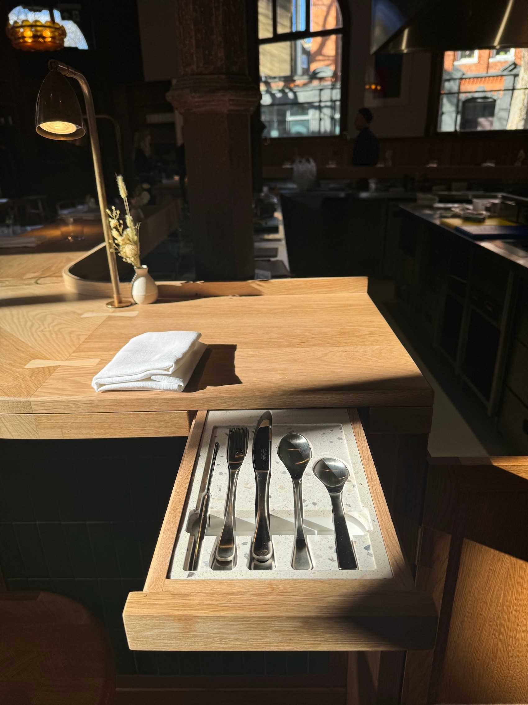 Solid surface cutlery drawer in wrap-around bar counter by Tim Parker Joinery (photo: James Latham).